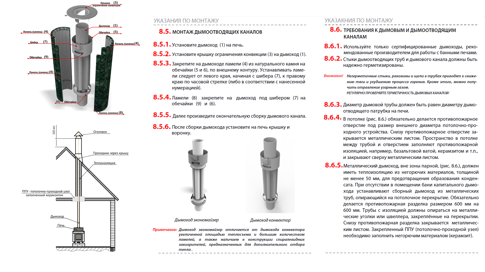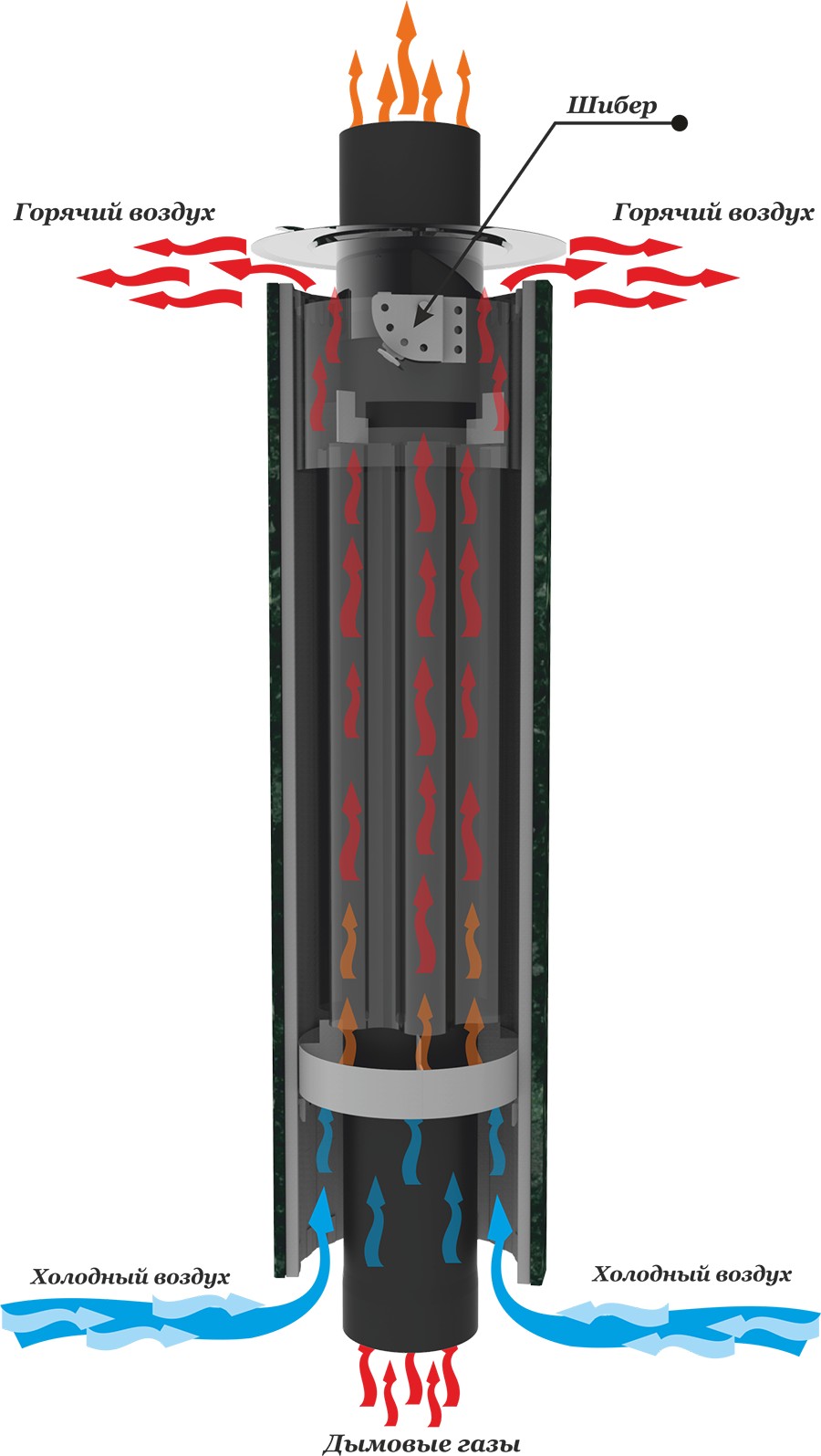 Дымоход-конвектор - элемент дымохода, с регулируемой конвекцией. Используется для повышения КПД печи за счет конвекции воздуха в помещении. Конвекция осуществляется через заданные каналы за счет регулируемой циркуляции воздуха. Возможность регулировки прогрева парной.