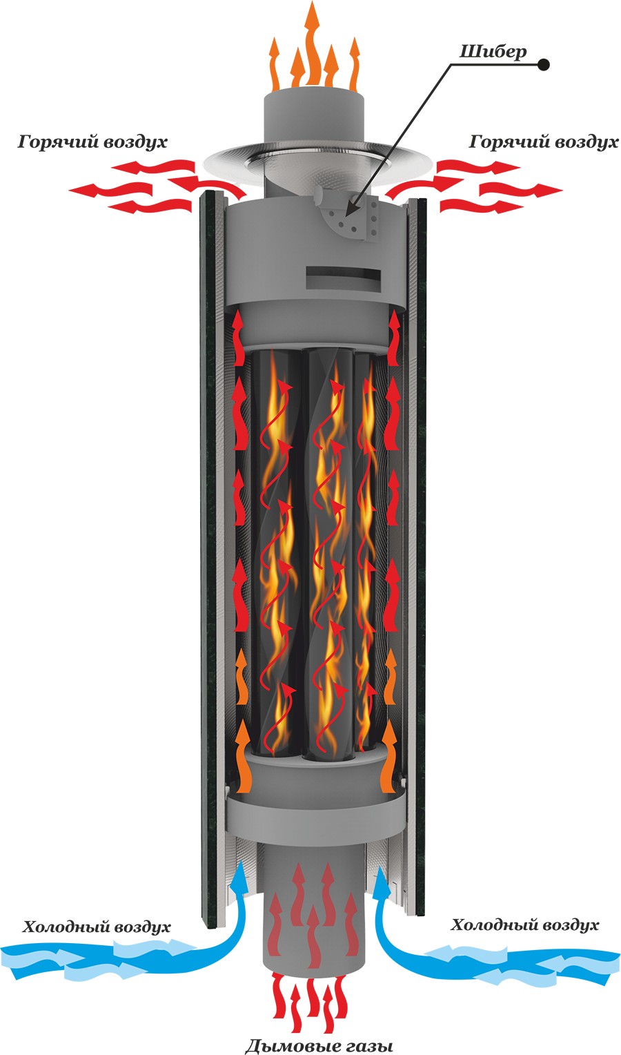 Дымовые газы, проходя через дымоход экономайзер, закручиваются и отдают тепло по максимуму. Изготавливается из конструкционной стали толщиной 3 мм. Дымоход рассчитан на весь срок службы печи. Использование дымохода-экономайзера помогает быстрее прогреть парную комнату. Дымоход оснащён шибером.