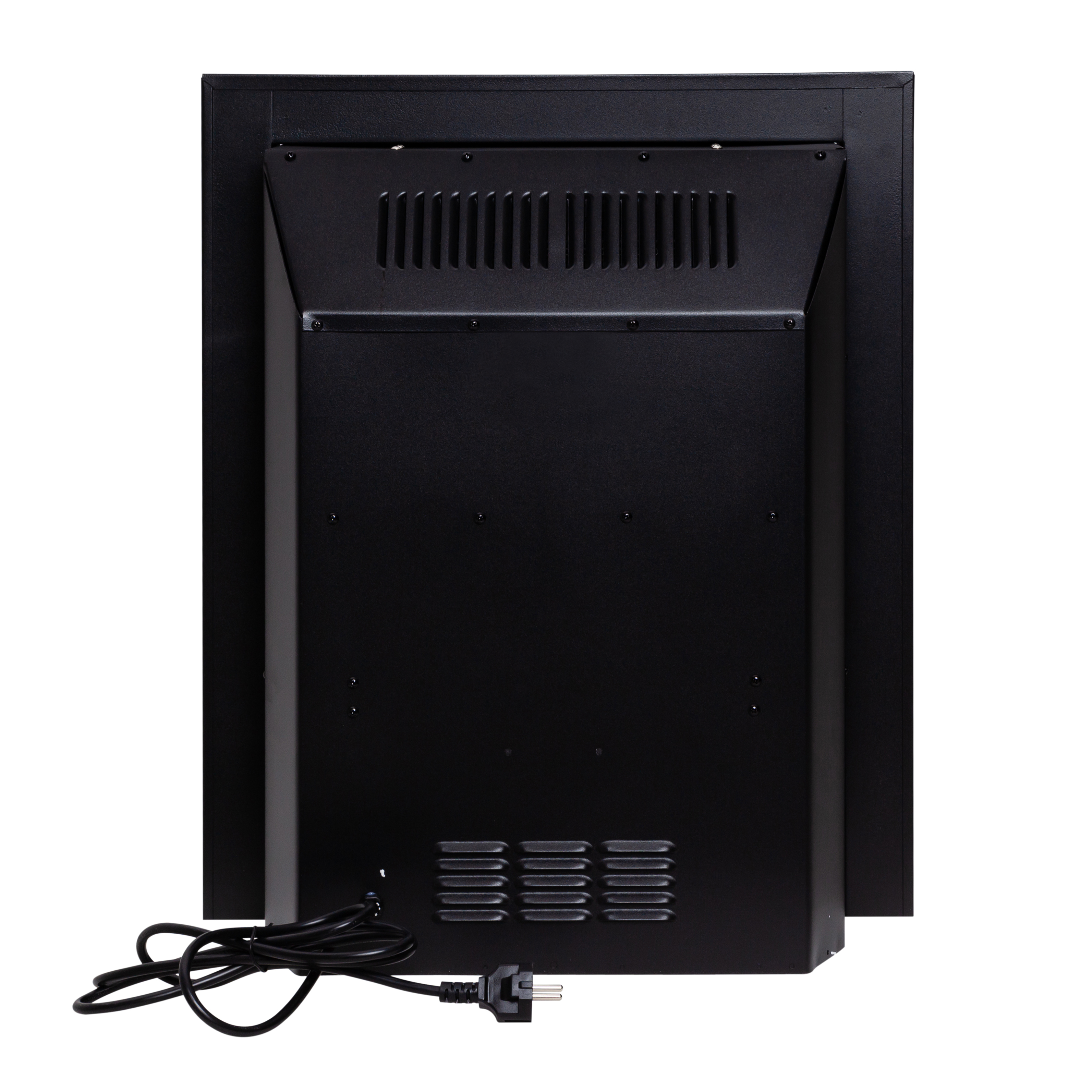 Электрический очаг Majestic Lux предназначен для встраивания в стандартные обрамления. Нагреватель с поддувом спрятан в козырьке очага и обеспечивает обогрев в прохладную погоду. Переключатель позволяет использовать два уровня мощности. В режиме визуализации пламени потребление электроэнергии составляет 80 Вт (две свечеобразные лампы E14 мощностью 40W).