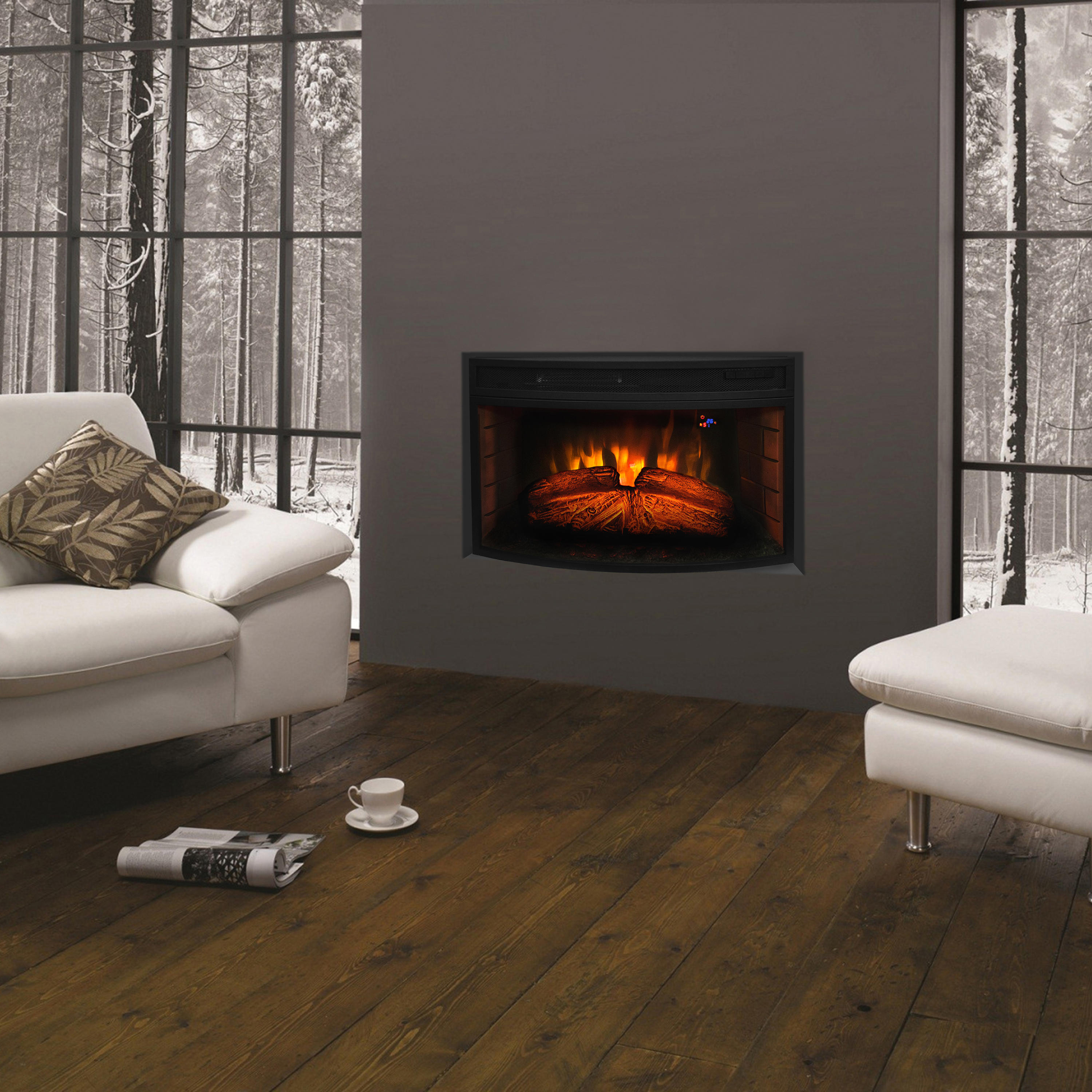 Современный электрический очаг с пультом ДУ на светодиодах. Предназначен очаг для встраивания в обрамления под широкий очаг. С потрясающим эффектом пламени (многоцветное пламя) и муляжом дров расположенных за полукруглым (панорамным) фронтальным стеклом