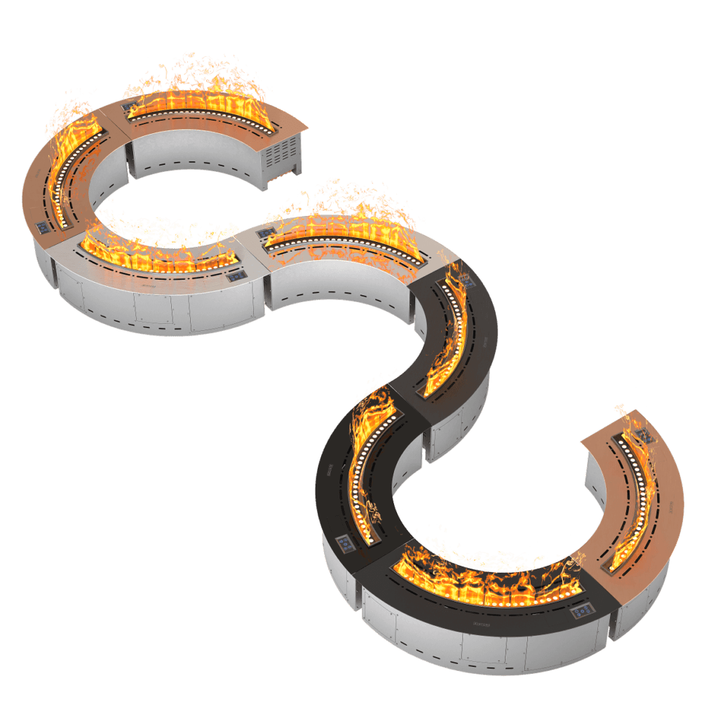 Удобная «секционность» модели позволяет собрать и замкнутый круг, и половину круга, или даже сложные элементы. Возможность соединения 15 топок с синхронным управлением позволит реализовать любой необычный проект.