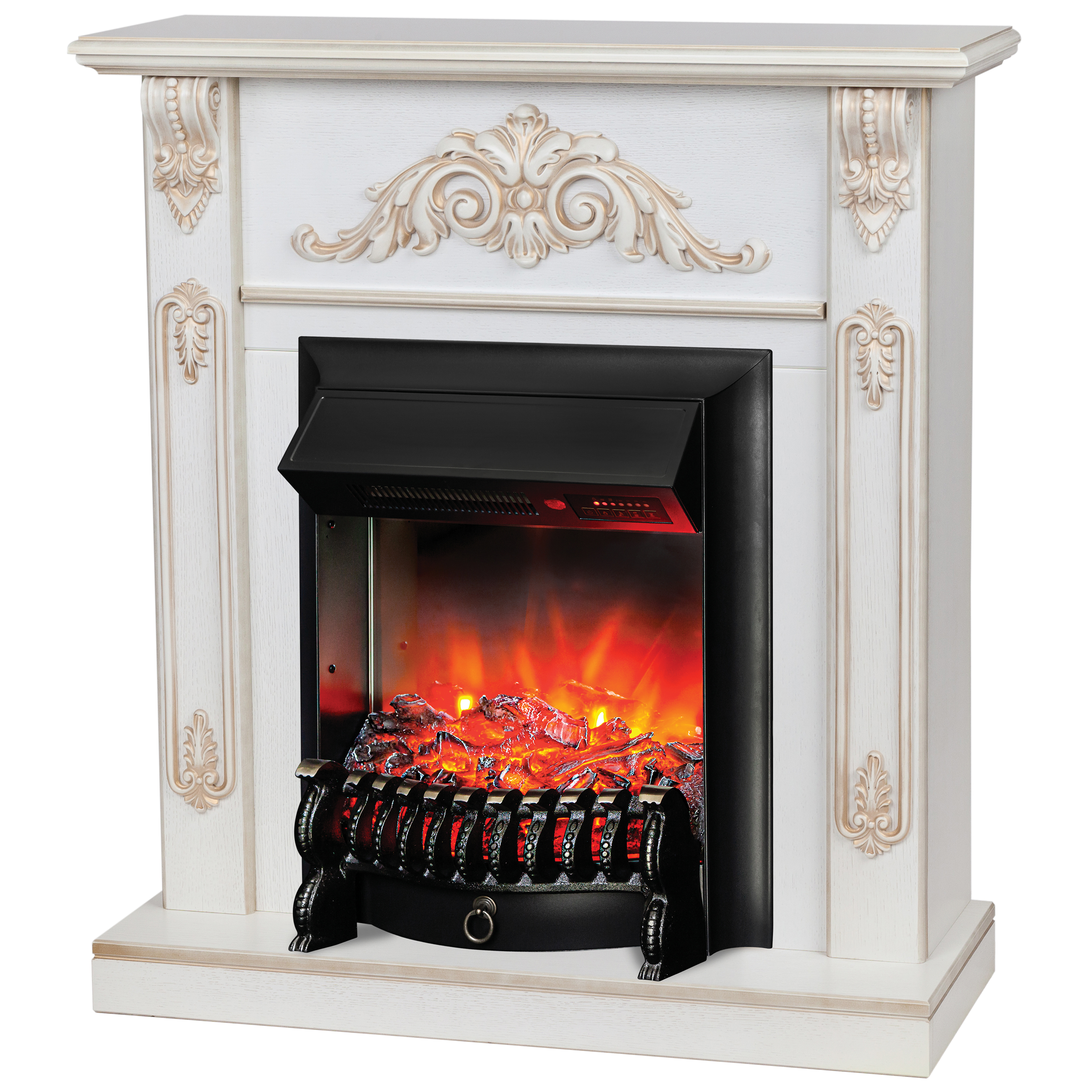 Электрический очаг Fobos Lux предназначен для встраивания в стандартные обрамления. В качестве муляжа - сгоревшие дрова. Нагреватель с поддувом спрятан в козырьке очага и обеспечивает обогрев в холодную погоду. Переключатель позволяет включать на полную (1 500 Вт) или половинную (750 Вт) мощность. В режиме визуализации пламени потребление электроэнергии составляет 80 Вт (две свечеобразные лампы E14 мощностью 40W)