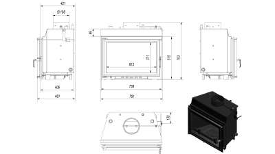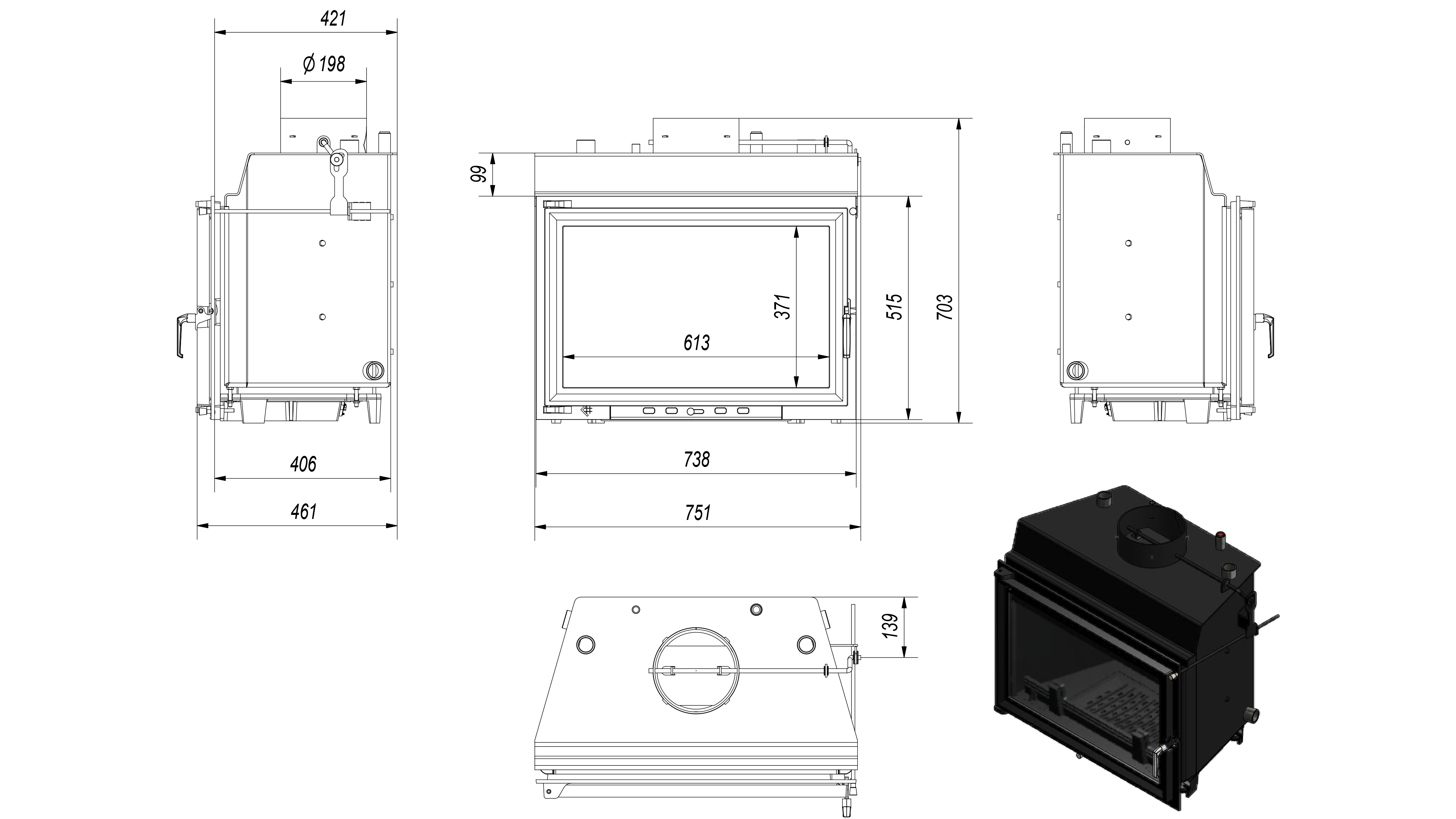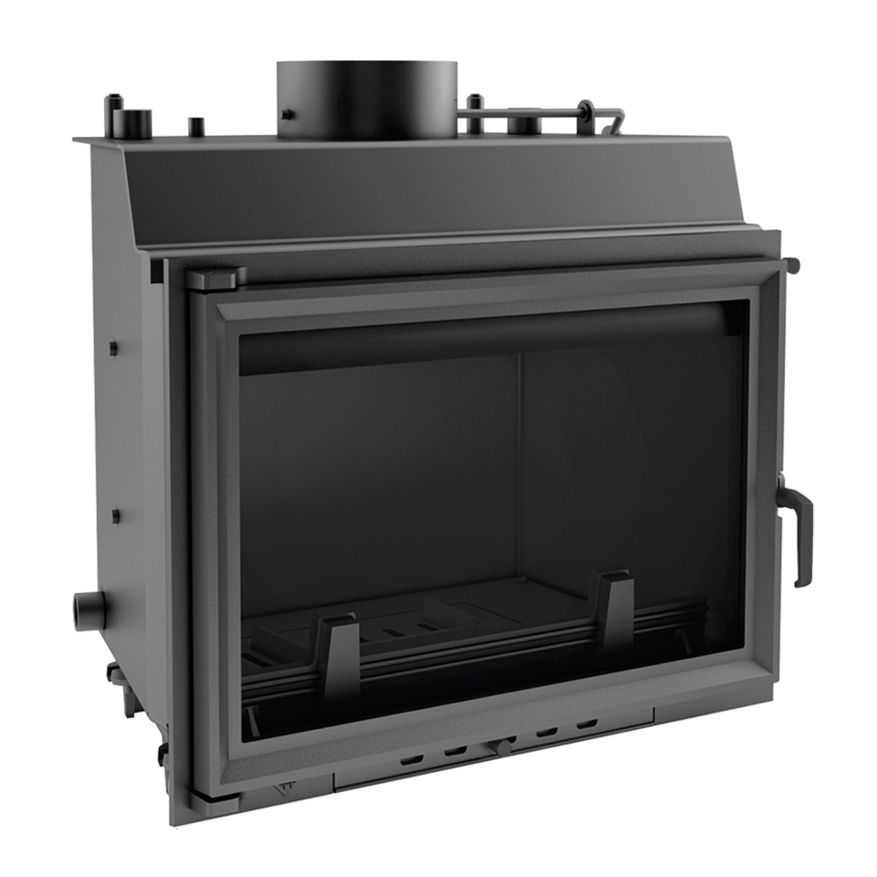 Данная каминная топка предназначена для работы в системе водяного отопления и интенсивного горения. Номинальная мощность топки (воздухогрейная) 12кВт, мощность водяного обогрева в среднем 8 кВт. Максимальное давление в система 2 бар. Топка работает как в открытых так и в закрытых системах. Емкость воды имеет объем 17 литра.