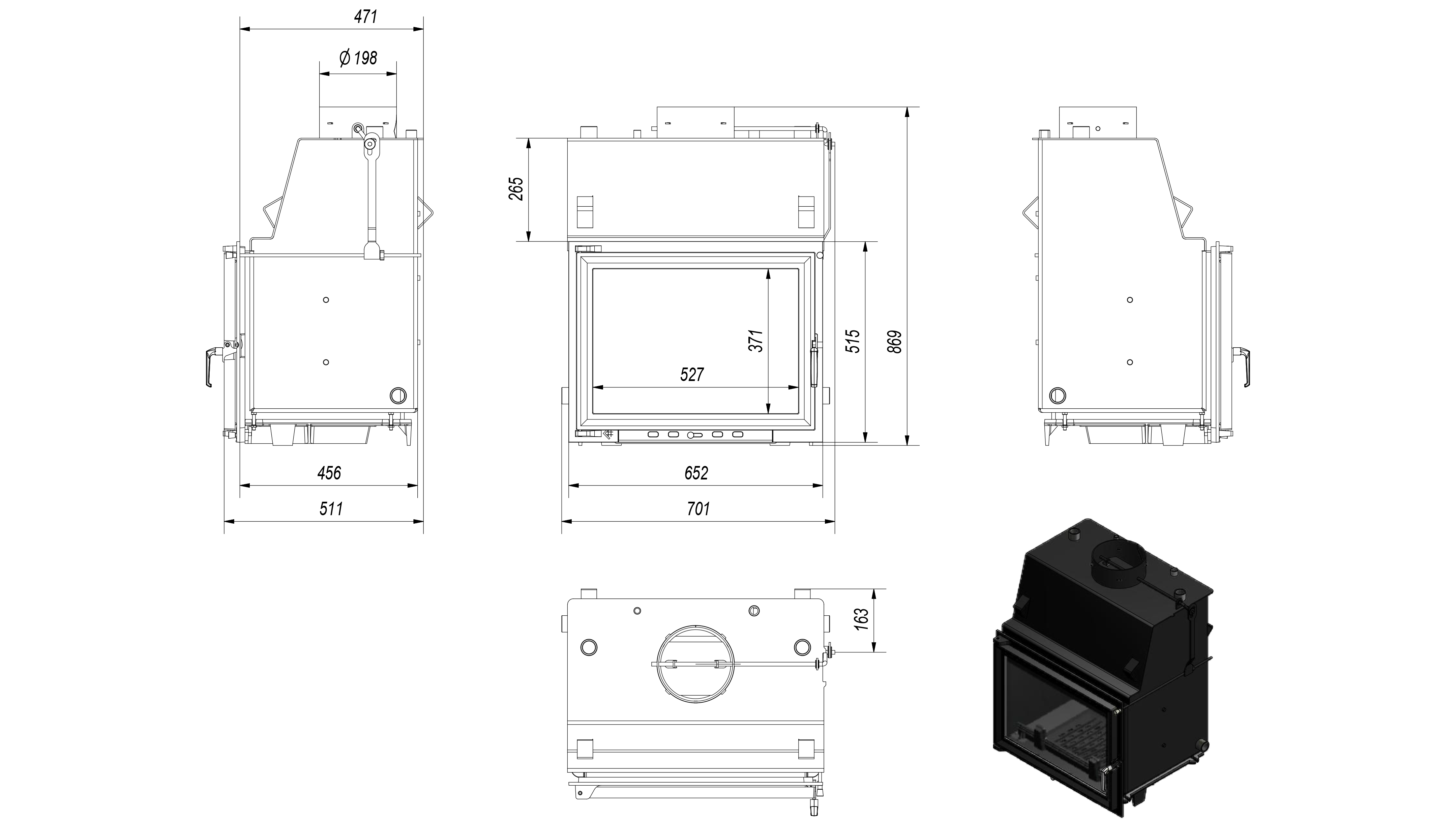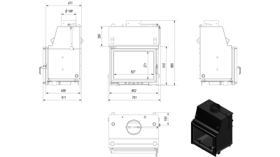 Данная каминная топка предназначена для работы в системе водяного отопления и интенсивного горения. Номинальная мощность топки (воздухогрейная) 15кВт, мощность водяного обогрева в среднем 8 кВт. Максимальное давление в система 2 бар. Топка работает как в открытых так и в закрытых системах. Емкость воды имеет объем 38 литров.