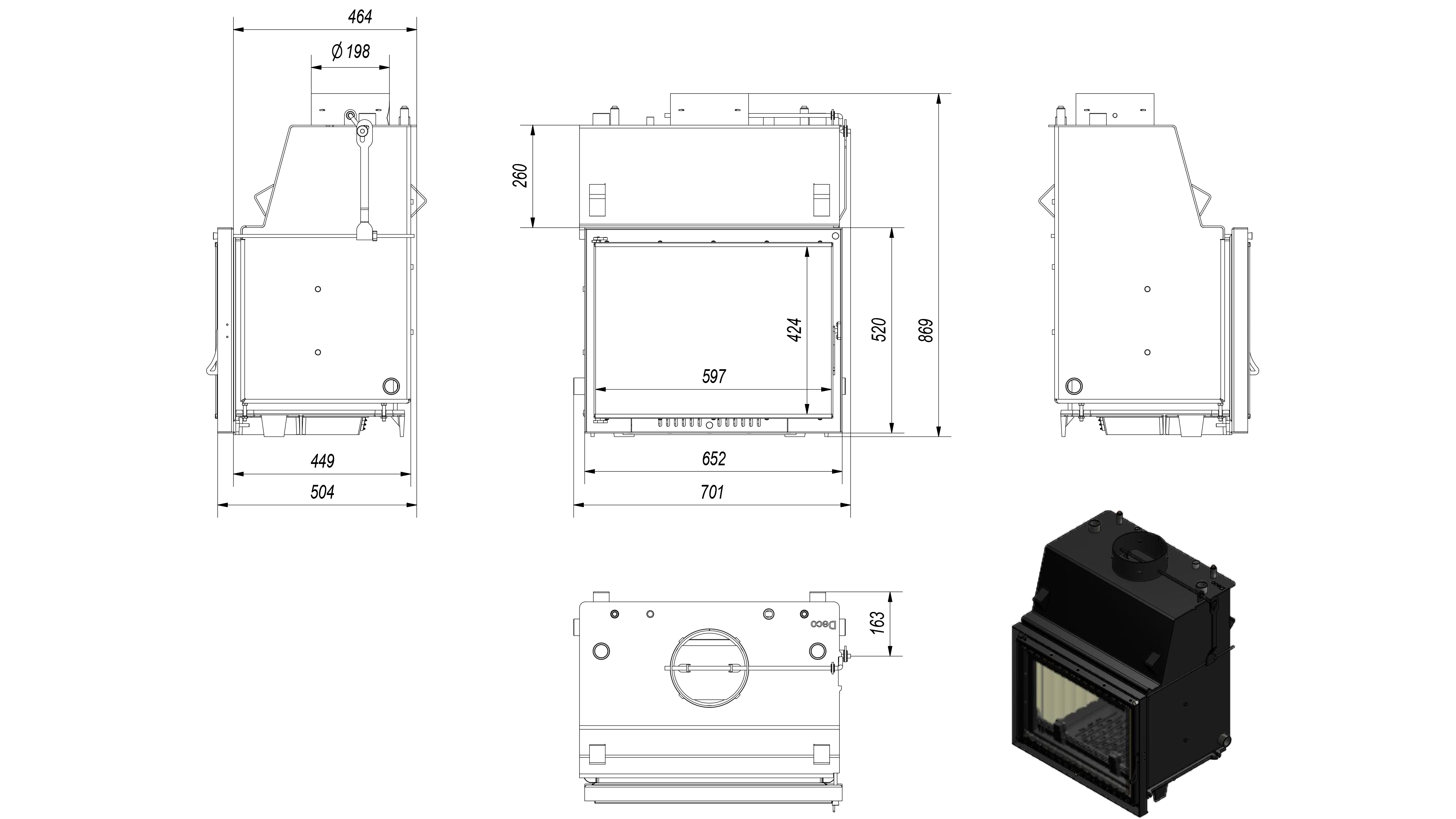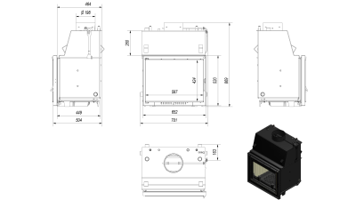 Данная каминная топка предназначена для работы в системе водяного отопления и интенсивного горения. Номинальная мощность топки (воздухогрейная) 15кВт, мощность водяного обогрева в среднем 8 кВт. Максимальное давление в система 2 бар. Топка работает как в открытых так и в закрытых системах. Емкость воды имеет объем 38 литров.