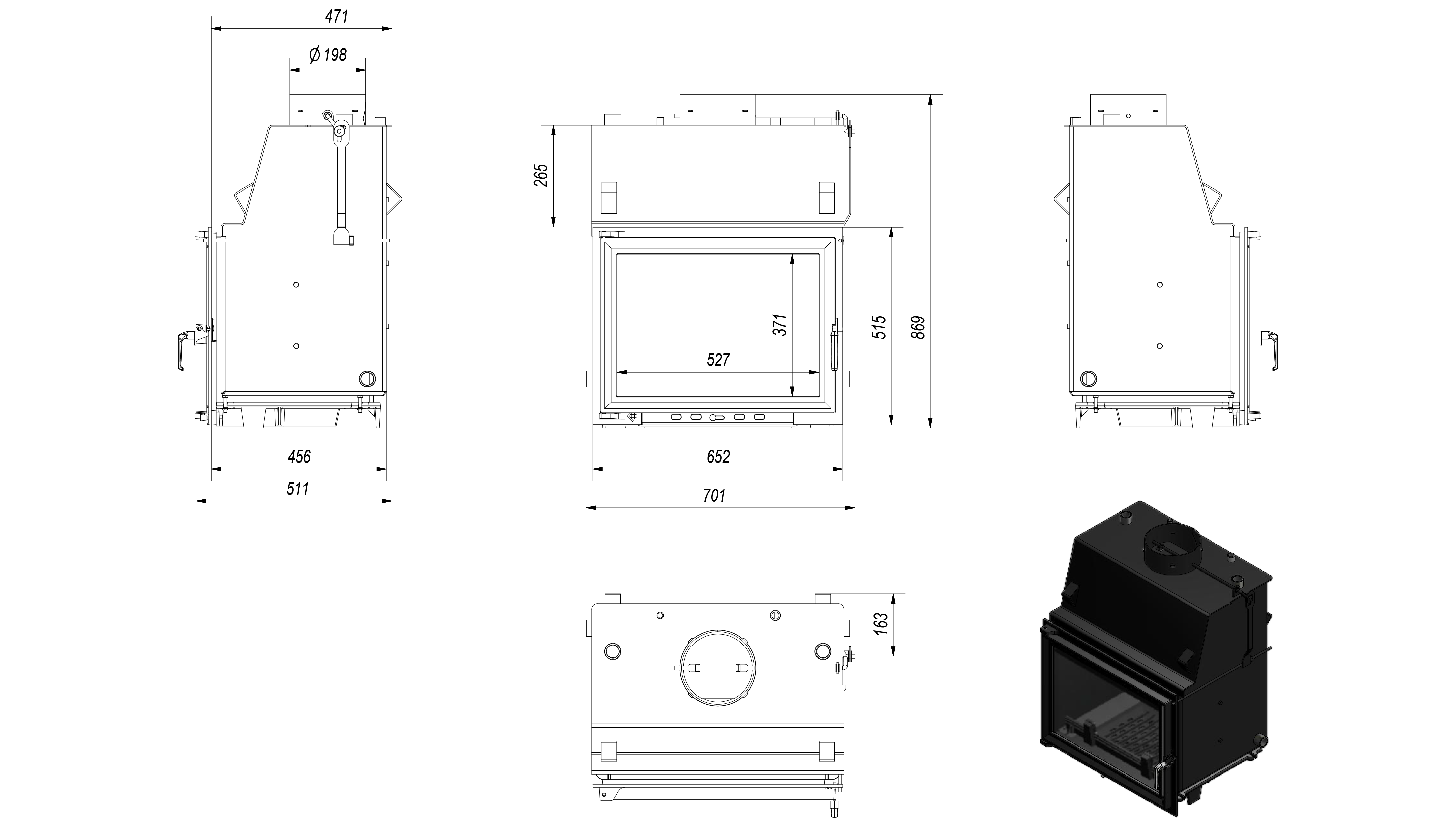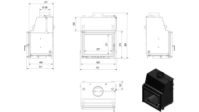 Данная каминная топка предназначена для работы в системе водяного отопления и интенсивного горения. Номинальная мощность топки (воздухогрейная) 19кВт, мощность водяного обогрева в среднем 15 кВт. Максимальное давление в система 2 бар. Топка работает как в открытых так и в закрытых системах. Емкость воды имеет объем 40,5 литров.