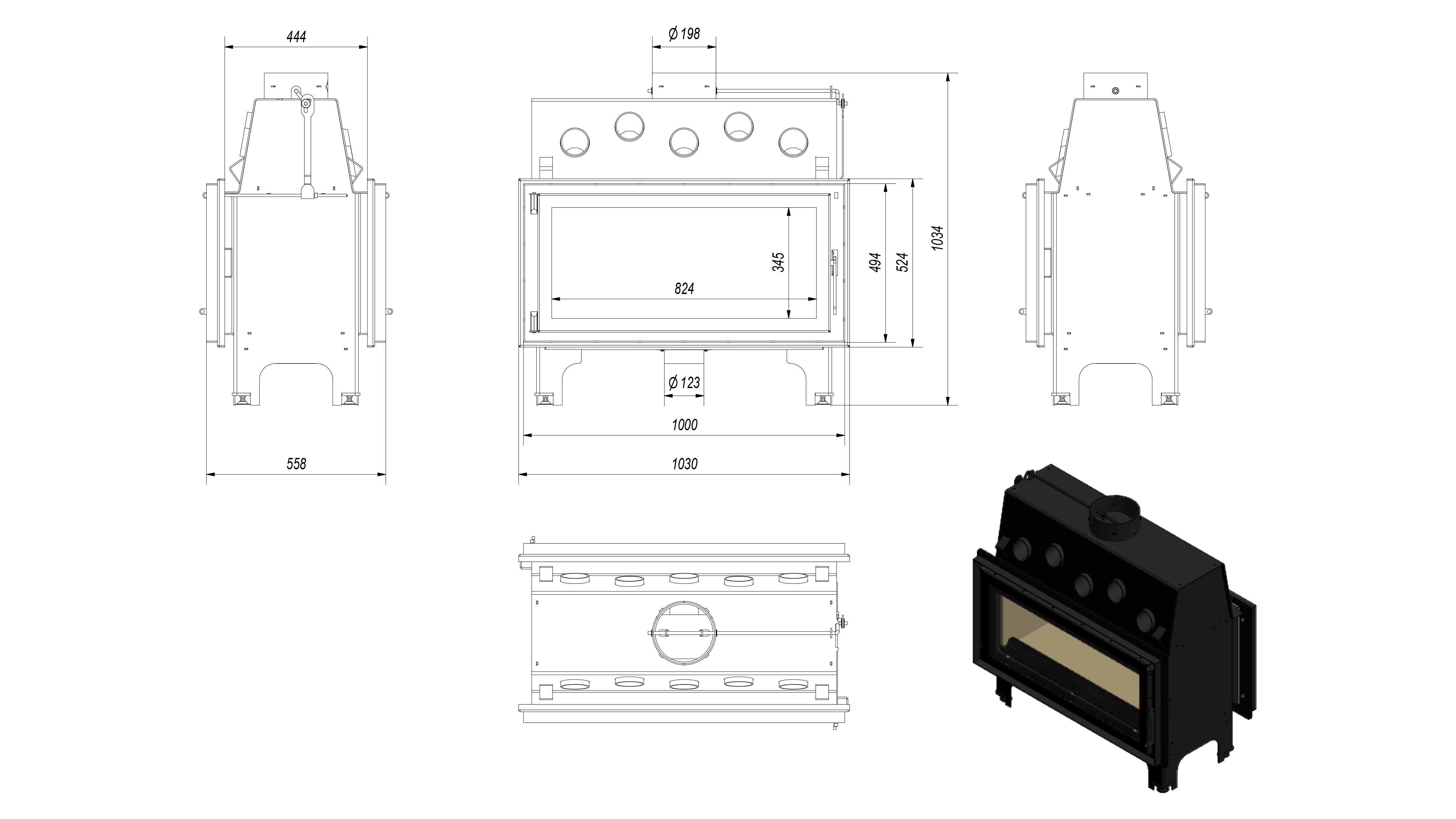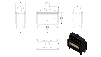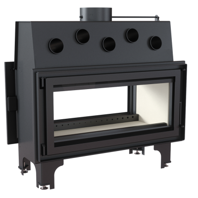 Дровяная сквозная топка для загородного дома. Создана из котловой стали с толщиной стенок 4 мм. Топочная камера обложена негорючим материалом - вермикулитом. Стекла на дверцах термостойкие и выдерживают температуру до 800оС. Имеется аналогичная модель топки, но с гильотинным механизмом. Топка имеет более одной двери. Топка оснащена подачей воздуха на горения извне.