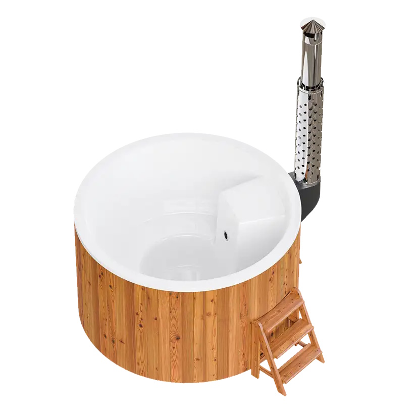 Модель полностью оправдывает свое название. Функциональность и дизайн изделия призваны сделать отдых премиальным. Чаша выполнена из высококлассного многослойного композита, а дополнительные защитные и декоративные свойства ей придает инновационное покрытие — гелькоут немецкой компании BUFA. Обшивку изготавливаем из экологичной термососны приятных оттенков. Выбирайте темный или светлый вариант, чтобы купель органично вписалась в дизайн окружающего пространства.