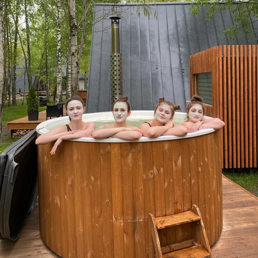 Для более удобного входа в воду в комплекте идет небольшая лестница. Дополните конструкцию специальной полочкой, чтобы брать в купель любимые напитки и отдыхать с максимальным комфортом.