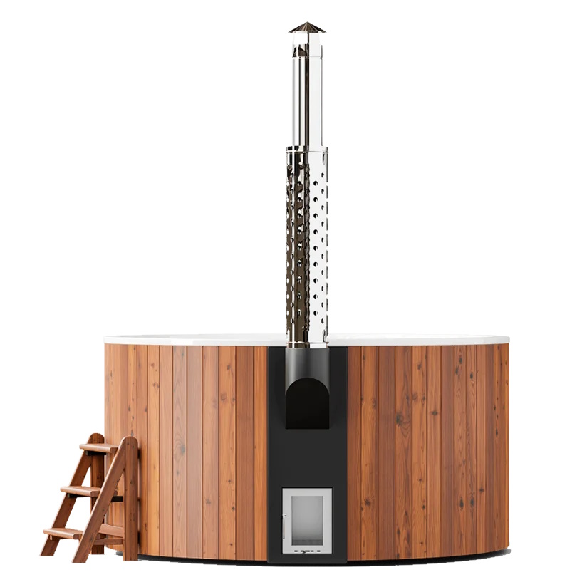 Модель полностью оправдывает свое название. Функциональность и дизайн изделия призваны сделать отдых премиальным. Чаша выполнена из высококлассного многослойного композита, а дополнительные защитные и декоративные свойства ей придает инновационное покрытие — гелькоут немецкой компании BUFA. Обшивку изготавливаем из экологичной термососны приятных оттенков. Выбирайте темный или светлый вариант, чтобы купель органично вписалась в дизайн окружающего пространства.