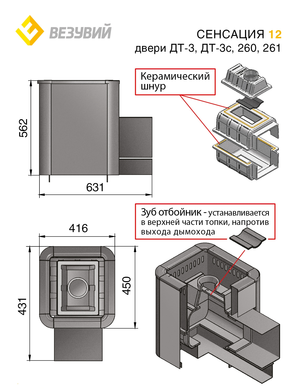 Банная чугунная печь Сенсация 12 (220) укомплектована чугунной герметичной дверцей Везувий 220 с жаропрочным стеклом «SCHOTT ROBAX». Объемная, вентилируемая каменка позволяющая максимально быстро нагреть камни с четырёх сторон в кратчайшие сроки. что значительно ускоряет нагревание воздуха в парилке за счёт образуемого им мощного конвекционного потока.