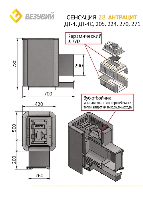 Преимущество печи в том, что топка печи состоит из 3-х элементов. На стыке между ними используется керамический шнур с рабочей температурой 1200 градусов. То есть топка печи абсолютно герметична! Для фиксации деталей между собой применяется болтовое соединение, что даёт 100% гарантию безопасности при эксплуатации.