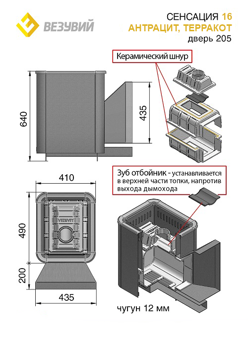 Банная чугунная печь Сенсация 16 (205) укомплектована чугунной герметичной дверцей Везувий 205 с жаропрочным стеклом «SCHOTT ROBAX». Объемная, вентилируемая каменка позволяющая максимально быстро нагреть камни с четырёх сторон в кратчайшие сроки, что значительно ускоряет нагревание воздуха в парилке за счёт образуемого им мощного конвекционного потока.