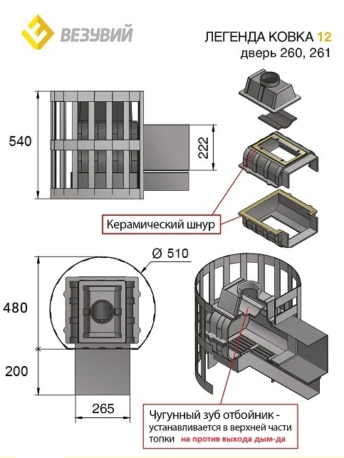 Преимущество печи в том, что топка печи состоит из 3-х элементов. На стыке между ними используется керамический шнур с рабочей температурой 1200 градусов. То есть топка печи абсолютно герметична! Для фиксации деталей между собой применяется болтовое соединение, что даёт 100% гарантию безопасности при эксплуатации.