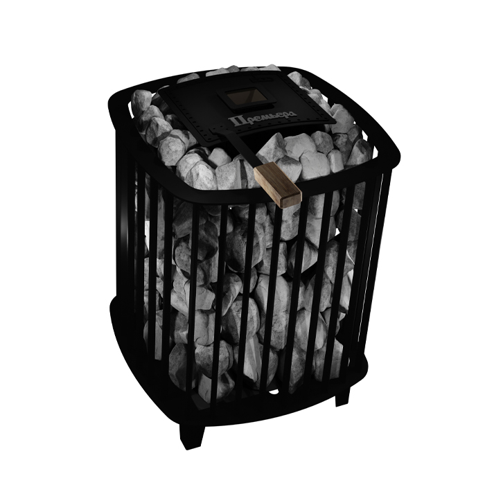 Разработанная специалистами фирмы конструкция эл. печи «Премьера Руса с закрытой каменкой» - это эффективное и оригинальное инженерное решение этих проблем. «Закрытая» каменка расположенная внутри «открытой» каменки. Такое решение обеспечило не только большую теплоаккумулирующую способность эл. печи за счет солидного объёма камня в «открытой» каменке, но и постоянно высокую температуру камня в «закрытой» каменке. А расположение «стакана» с теплоаккумулятором внутри «закрытой» каменки решило проблему с увлажнением воздуха в парилке.