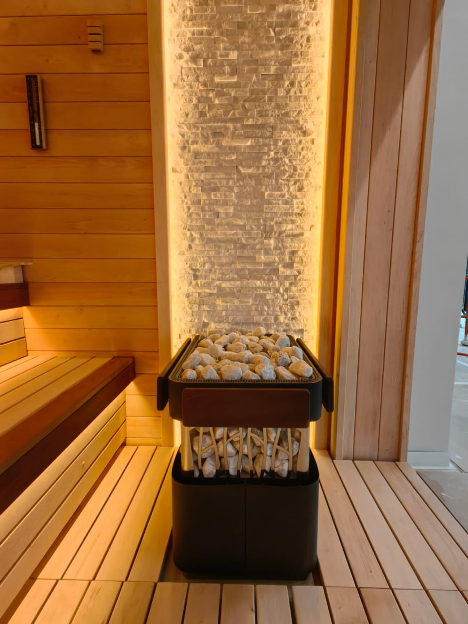 Много правильного лучистого тепла, которое держится очень долго. Можно смело подавать воду на камни, создавая атмосферу настоящей русской бани с большим количеством мелкодисперсного пара.