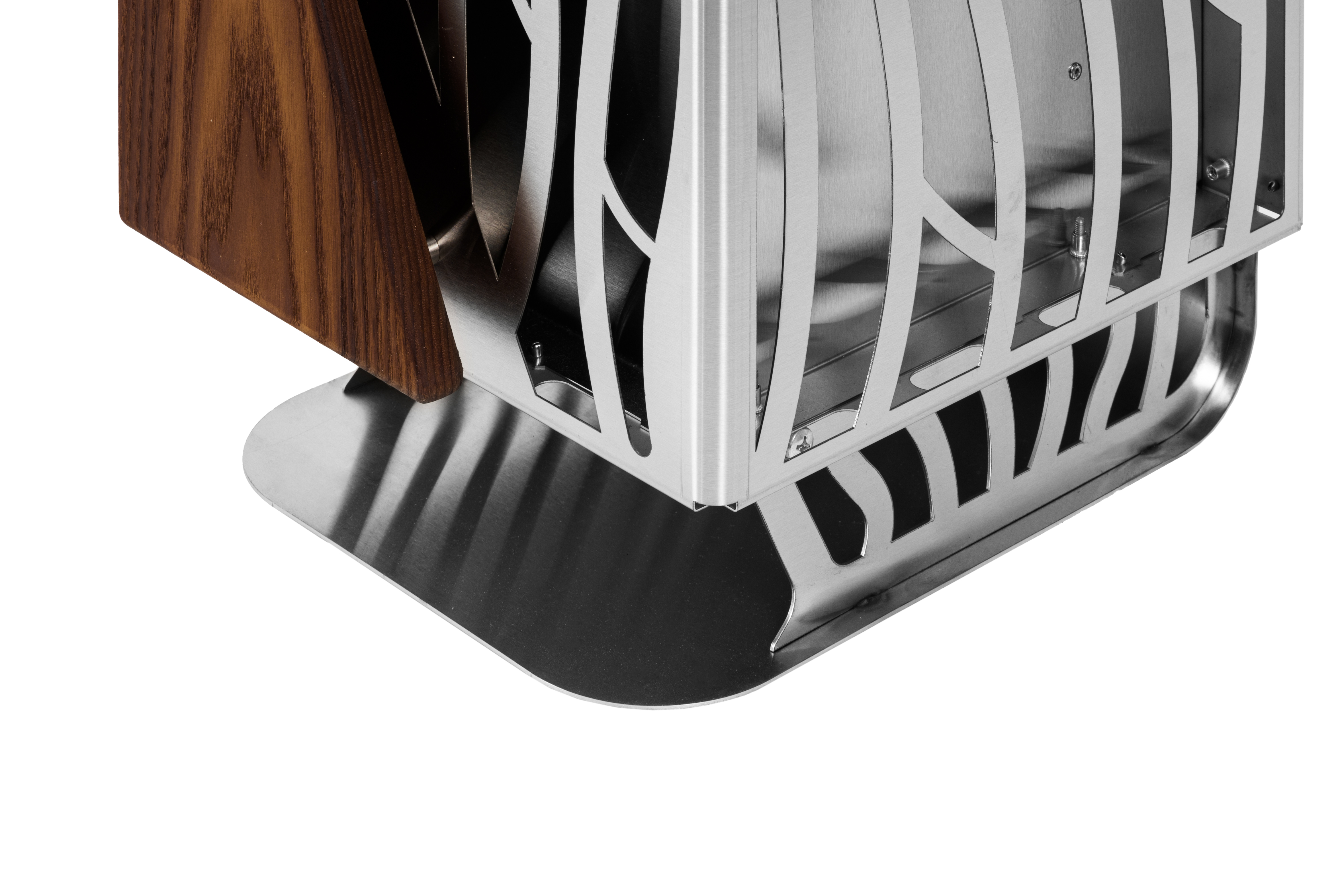 Встроенное ограждение из термоясеня по периметру печи защищает от случайных ожогов. Кронштейн на задней части кожуха позволяет прикрепить каменку к стене для дополнительной надежности.