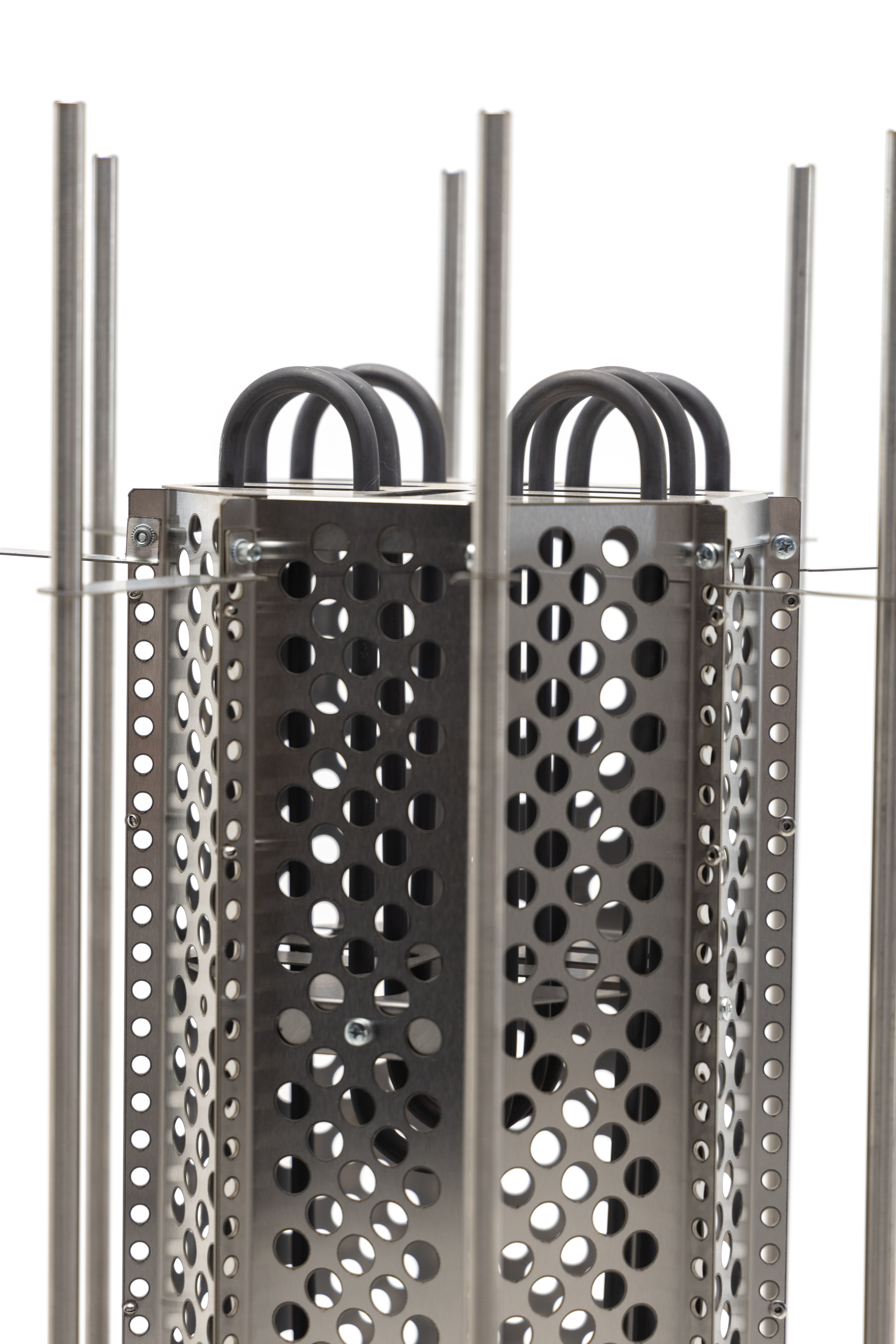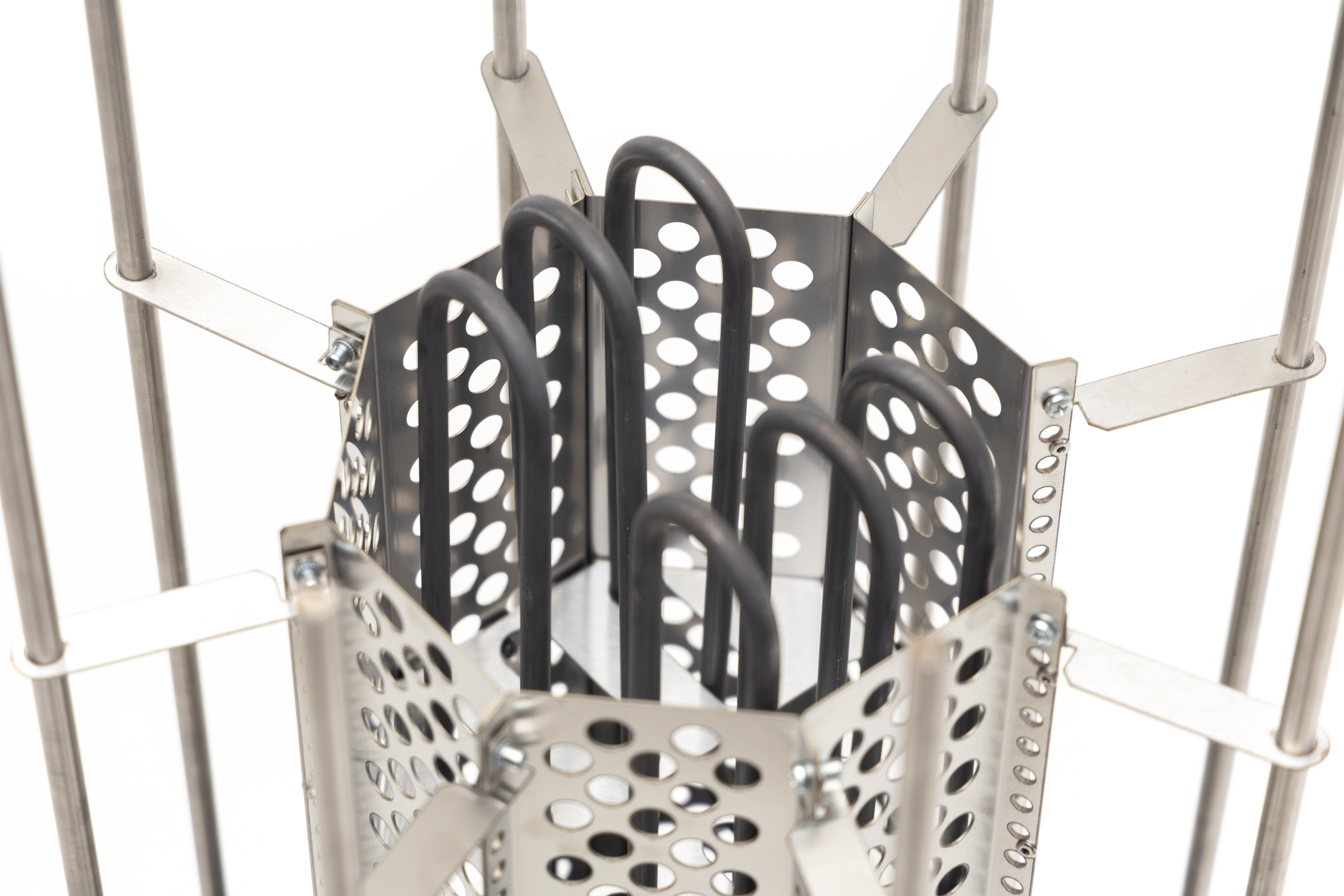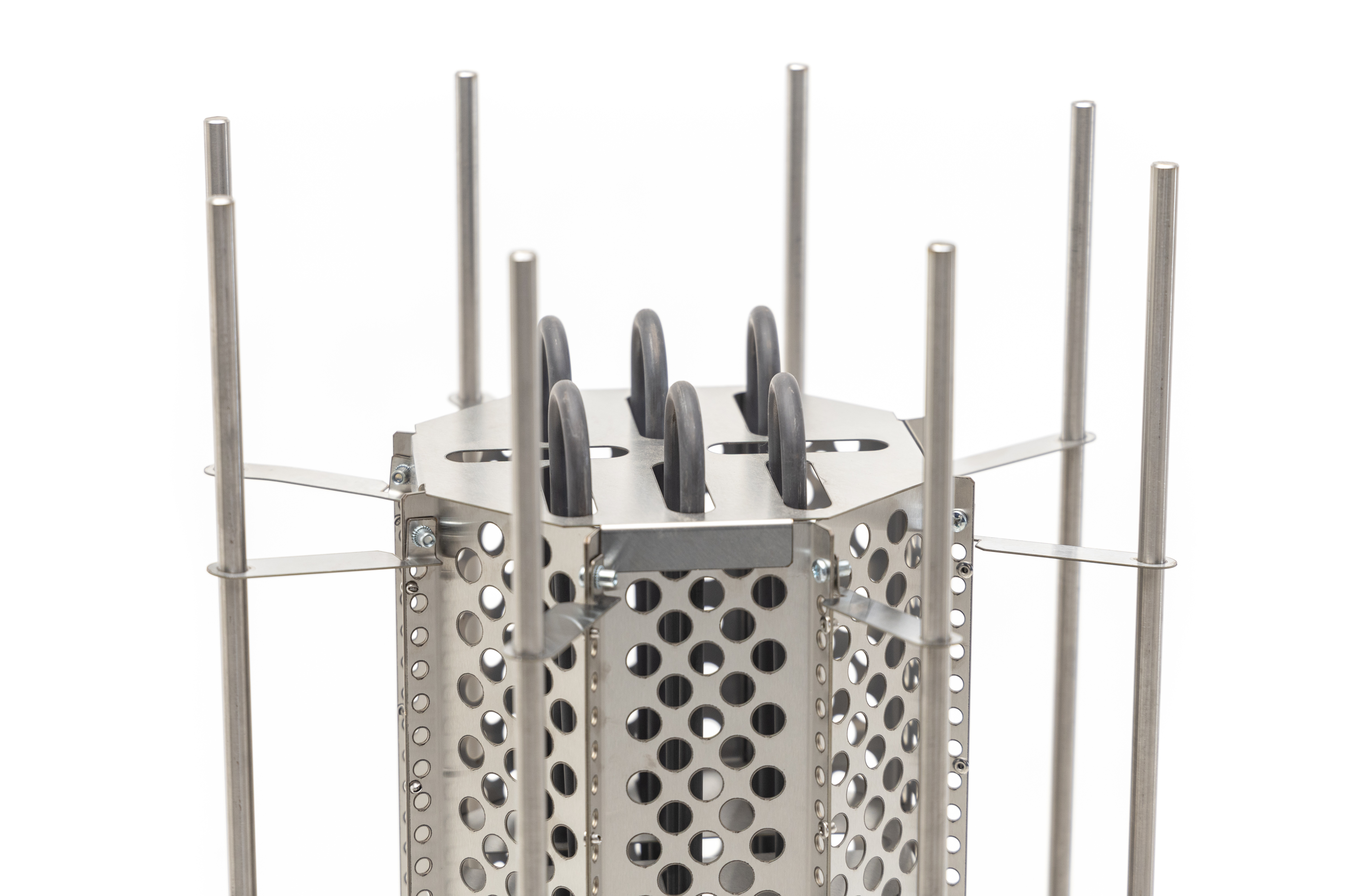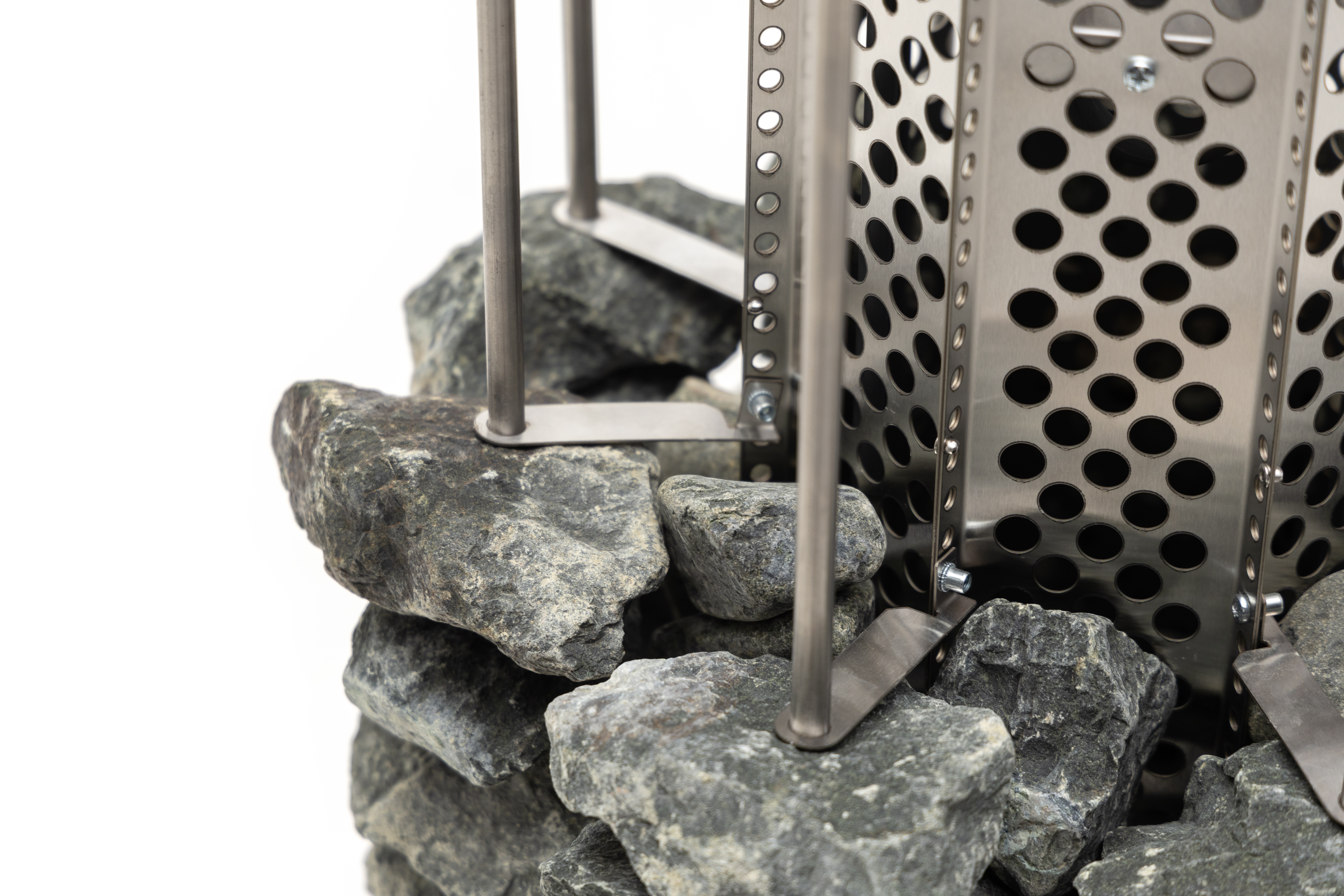 ТЭНы, защитный кожух для ТЭНов, шпильки для нанизывания камней, фиксаторы шпилек, нижняя часть – все сделано из жаростойкой, прочной, устойчивой к коррозии нержавеющей стали AISI 304.