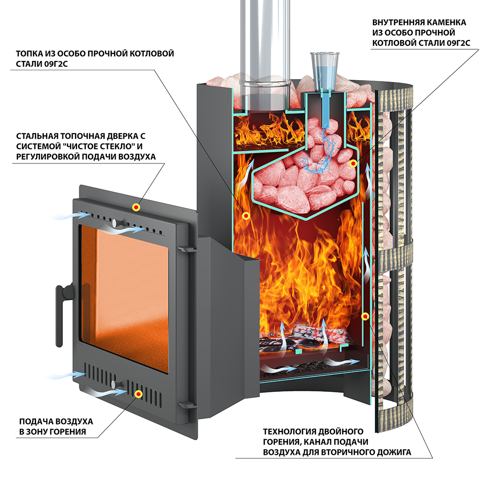 Получившийся мелкодисперсный пар выходит через пароконвекторные каналы на боковых поверхностях топки. Выйдя через щелевые отверстия, пар по П-образному профилю направляется вверх, на камни открытой каменки.