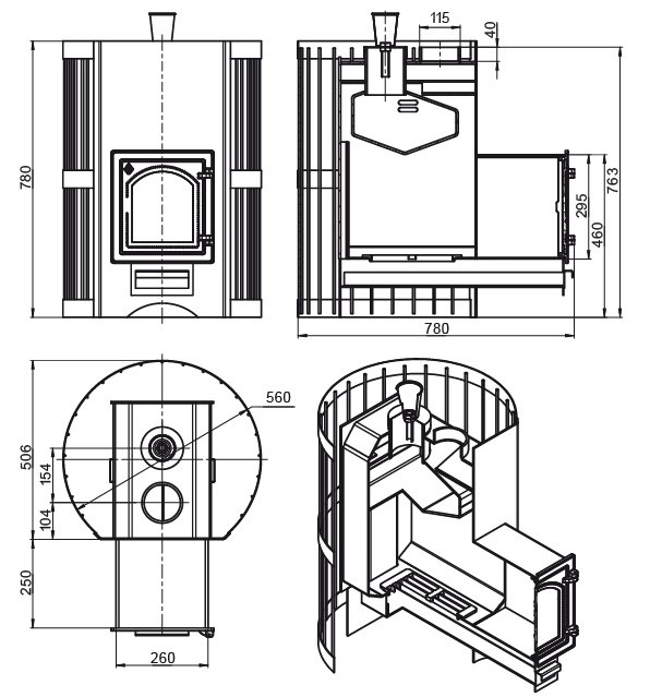 Съёмный чугунный колосник в сочетании со скошенными краями боковой части стенки облегчает уход за топкой, уборки золы и несгоревших углей.