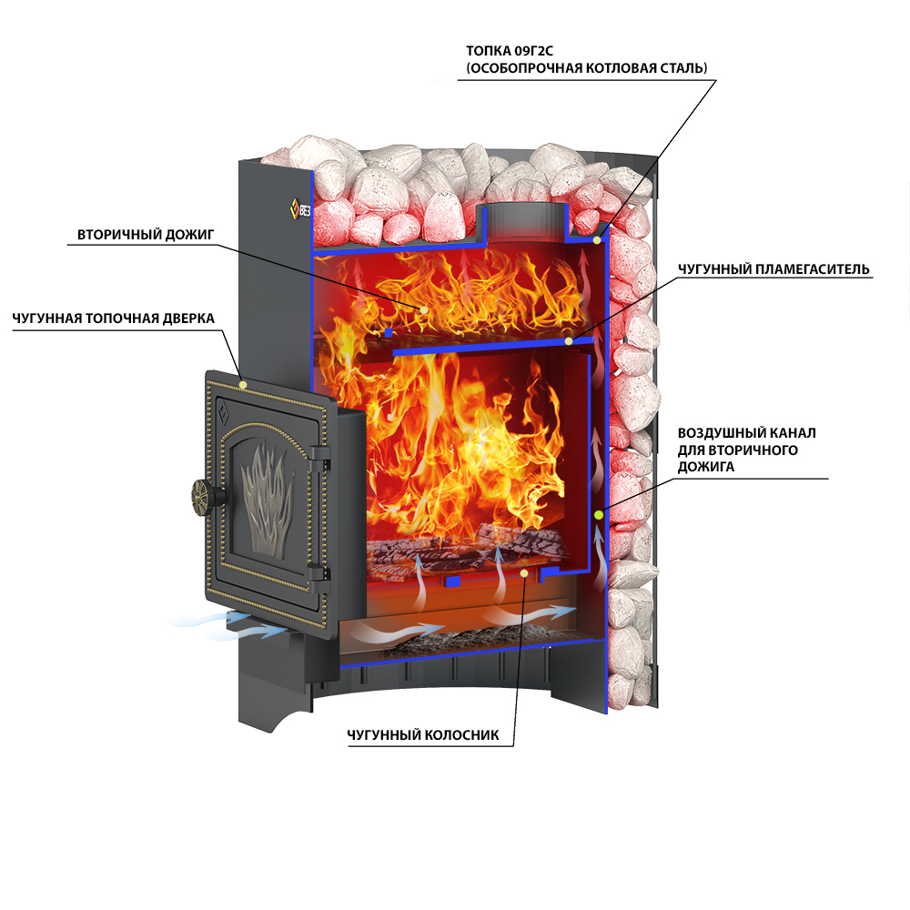 Воздух в зону горения подаётся через поддувало, его количество регулируется зольным ящиком совкового типа. Открытый зольник усиливает горение, закрытый – замедляет его. Чугунный пламегаситель перенаправляет поток горячего воздуха и дымовых газов к задней части топки. Это позволяет снять с печи максимум энергии в единицу времени. Чугунная дверь при нагревании не деформируется, сохраняет свою форму при остывании и предотвращает попадание продуктов горения на пол перед топкой. Печи Везувий СКИФ оснащаются сетками для камней. Сетки могут быть сделаны из металлического прутка или кованой стальной ленты шириной 40 мм. В сетки по всей высоте укладываются камни для бани, обеспечивая большой объём заклада и длительное удержание тепла после прогрева каменки.