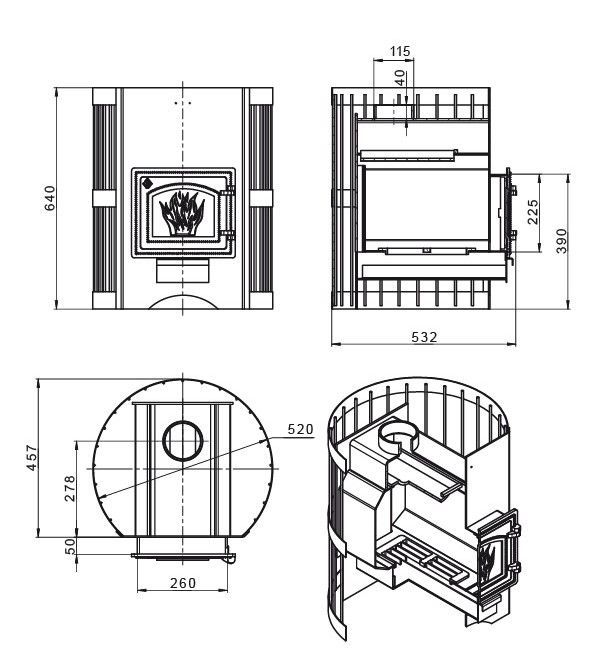Съёмный чугунный колосник в сочетании со скошенными краями боковой части стенки облегчает уход за топкой, уборки золы и несгоревших углей.