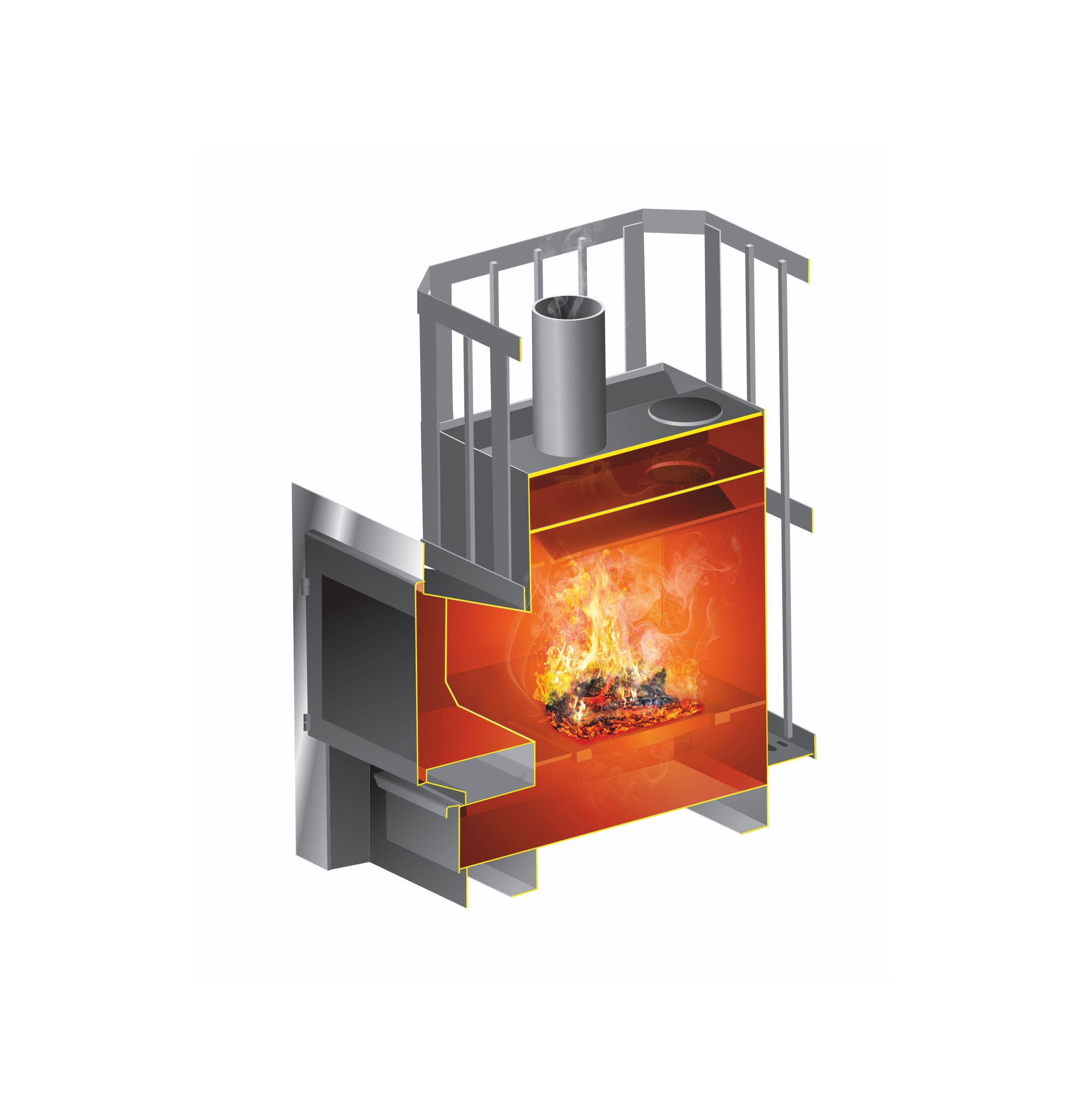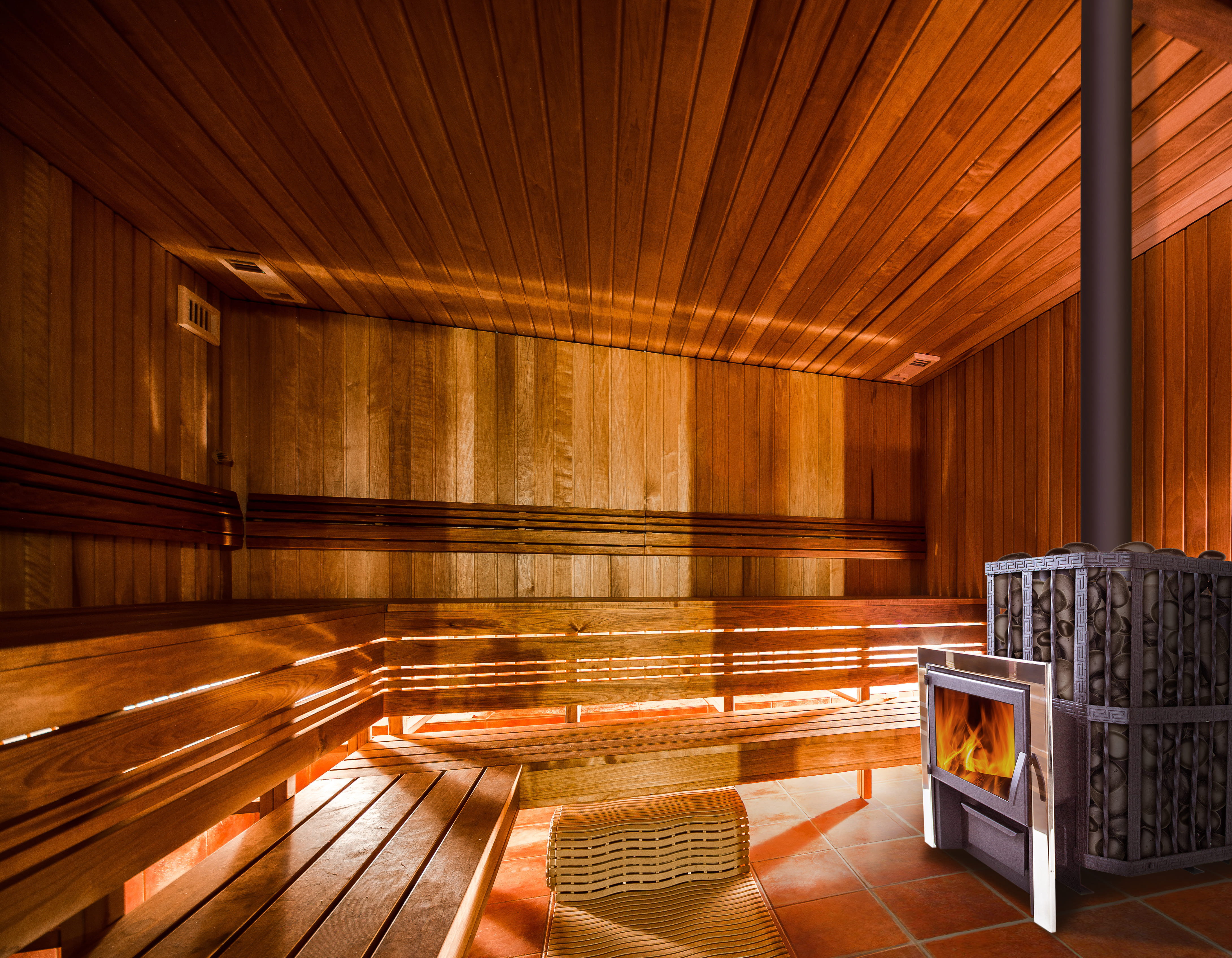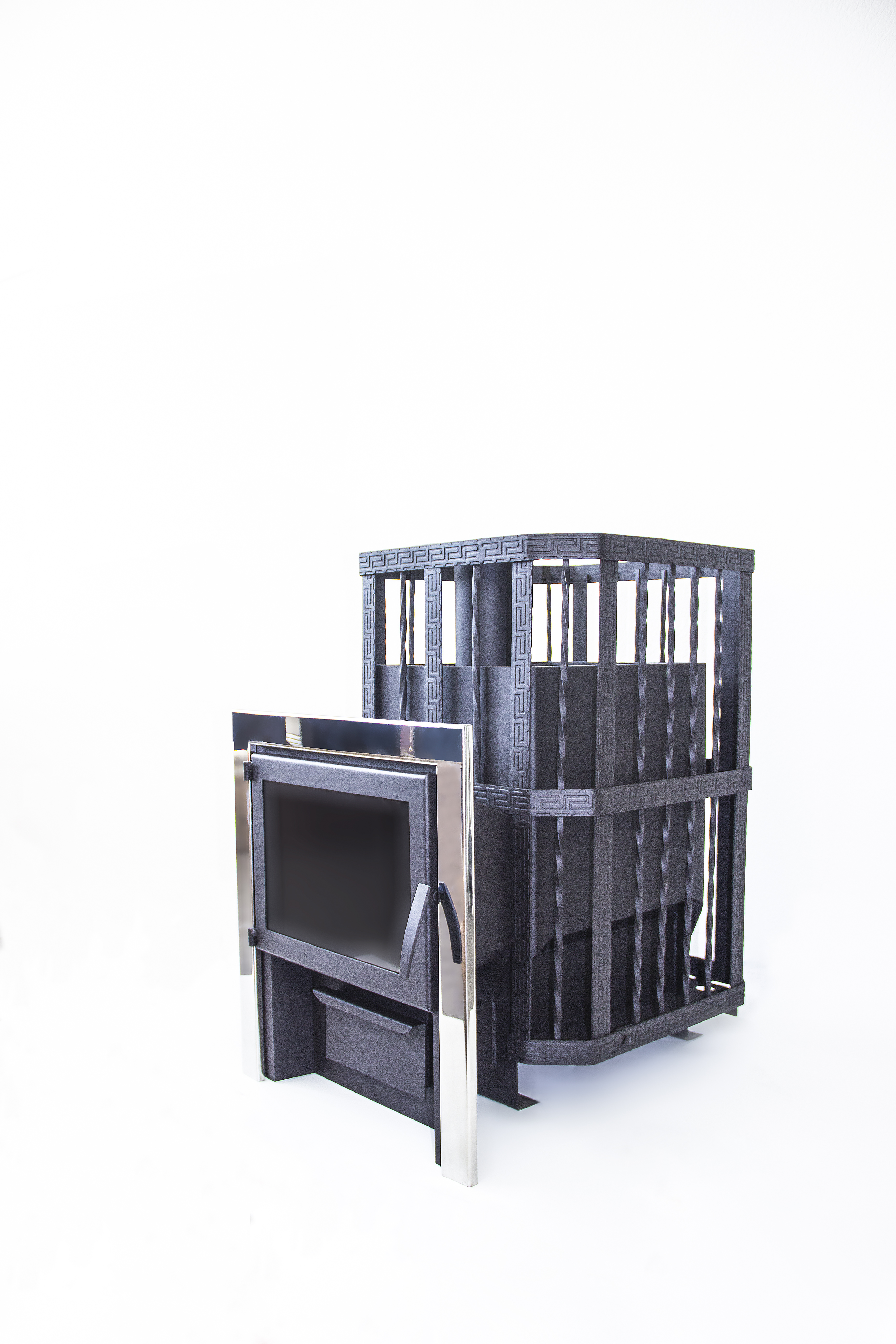 Сетка вокруг печки рассчитана на 200 кг банного камня. Полный прогрев такого количества камней до необходимой для русской бани температуры происходит за 120 минут.