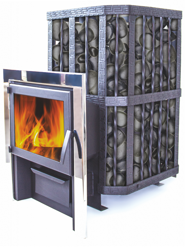 Банная печь имеет большое панорамное стекло диагональю 43 см. В печи реализована система «Чистая стекло», что не дает стеклу мутнеть и коптиться.