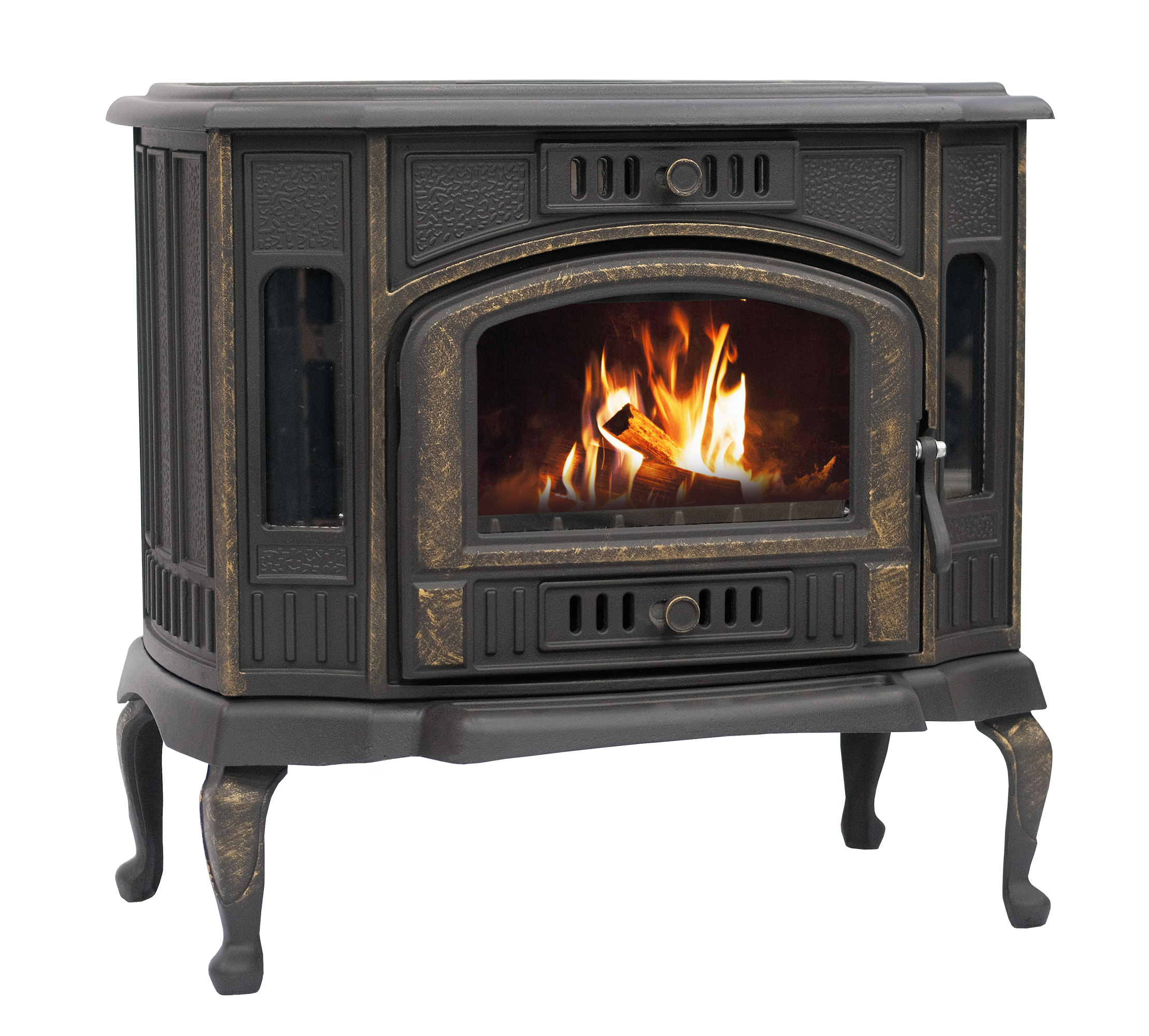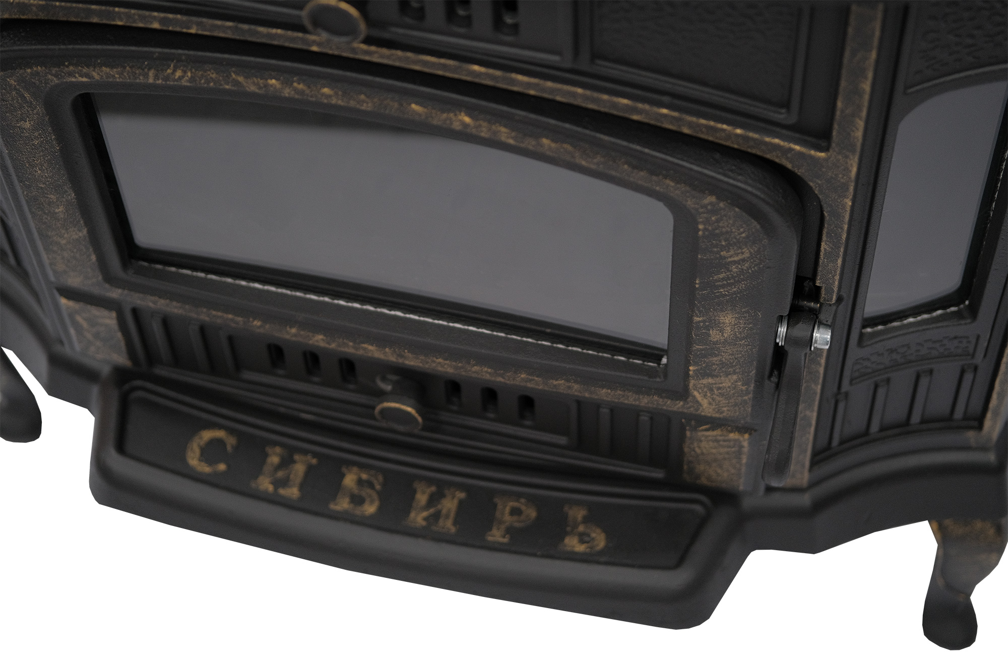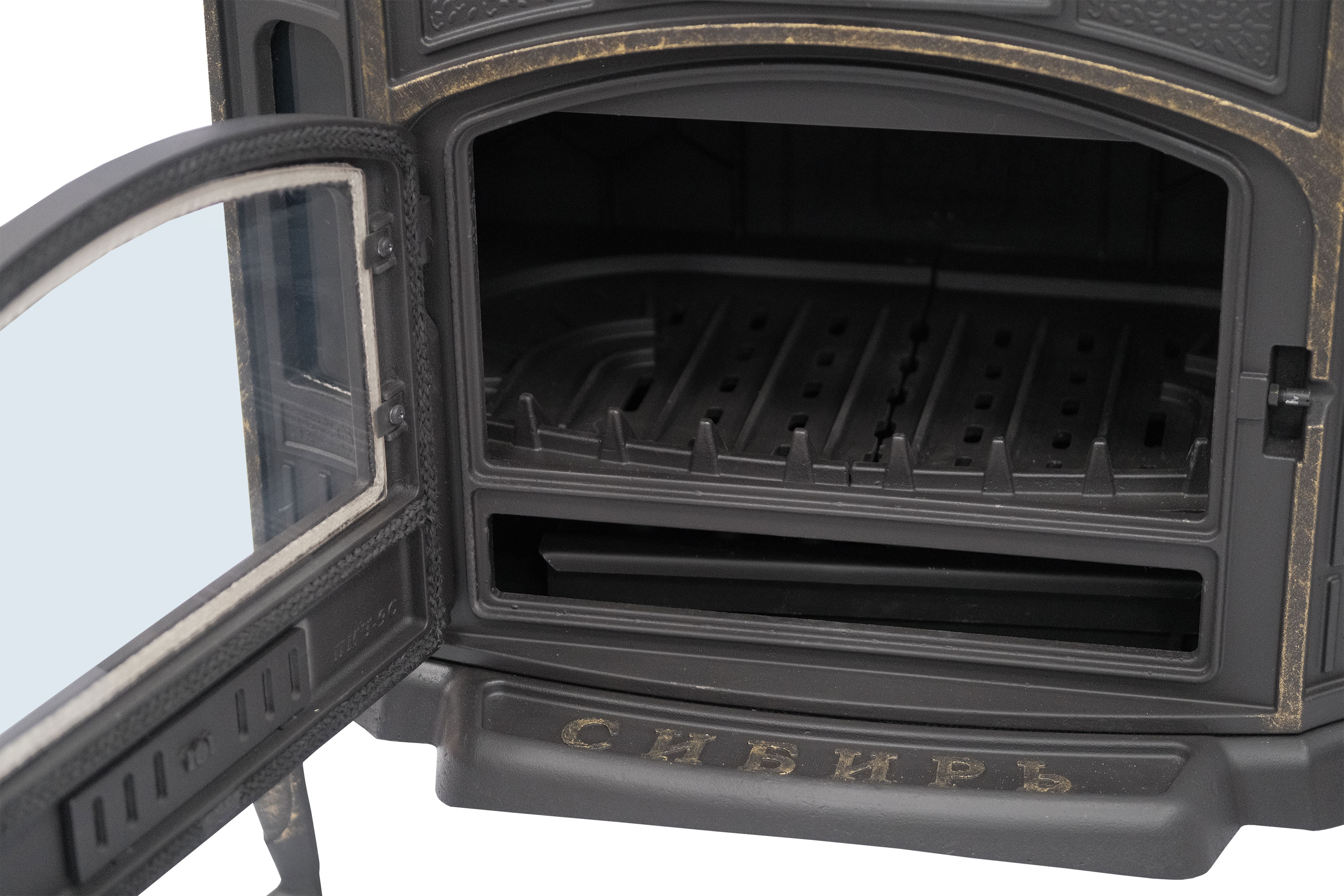 Помимо этого, дверка чугунной печи-камина «Сибирь-10», оснащена термостойким стеклом, что позволяет контролировать процесс горения, не открывая саму дверку. Плотность сочленения между чугунным основанием топочной дверки и термостойким стеклом обеспечивает термостойкий шнур, который предназначен для ее герметичного запирания. Это в свою очередь, исключает возможность проникновения несанкционированного воздуха в промежутках между дверкой и передней стенкой печи-камина «Сибирь-10». Дополнительные боковые стекла, расположенные по обеим сторонам дают возможность созерцать горение дров и наблюдать за живым огнем с разных углов обзора.