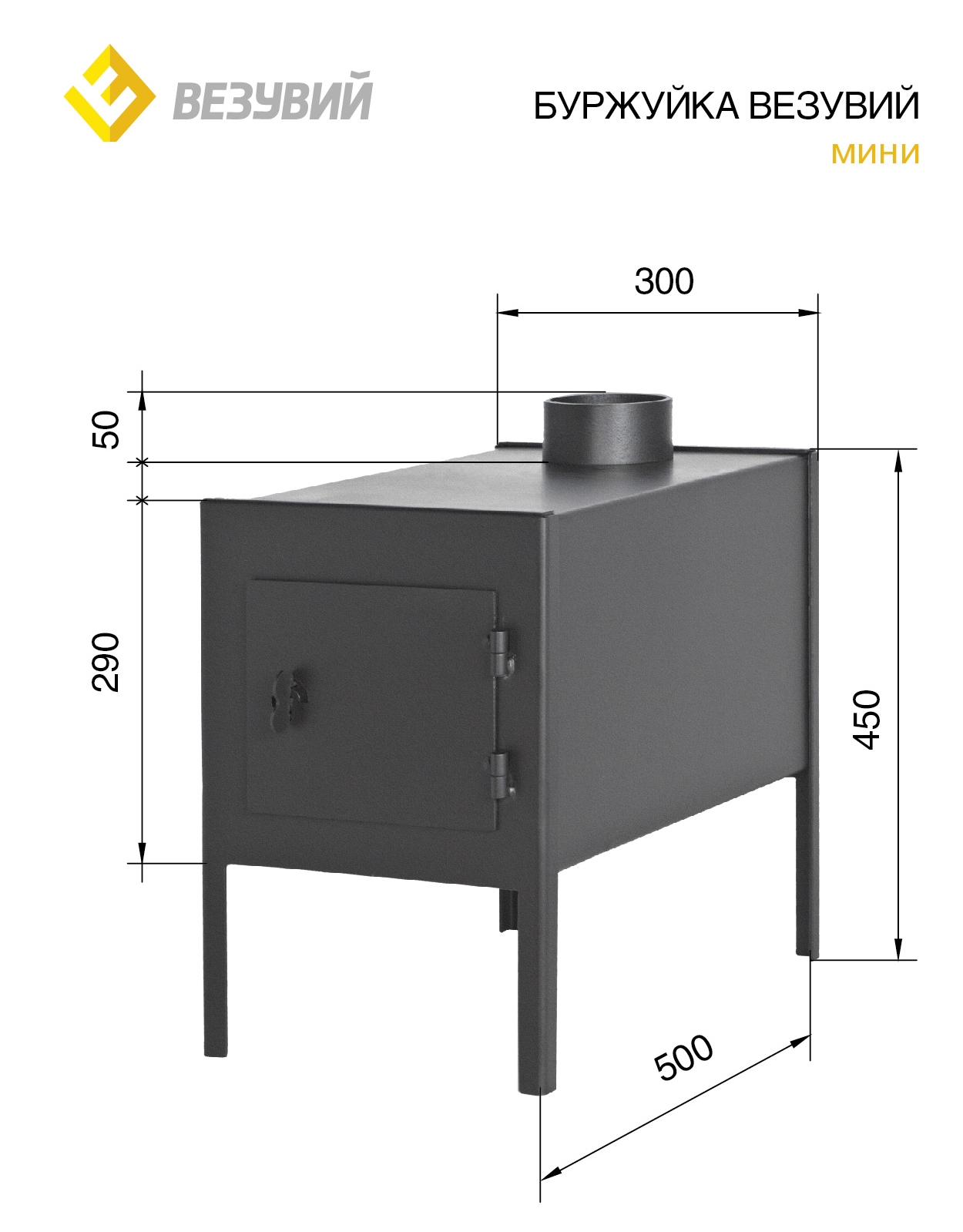Везувий Везувий «Мини» – стальная отопительная дровяная печь типа «буржуйка» со стальной дверцей.