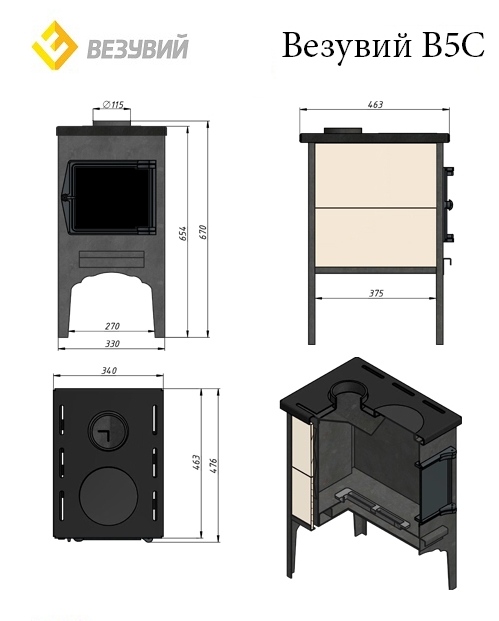 Отопительная печь «Везувий» В5С предназначена для установки в различных хозяйственных помещениях небольшого размера. Печь изготовлена из специальной конструкционной стали. Верхнюю горизонтальную поверхность можно использовать для приготовления пищи. Печь укомплектована чугунным колосником и чугунной не герметичной дверцей с огнеупорным стеклом Везувий ДТ-3С. Печь облицована Керамическими вставками.