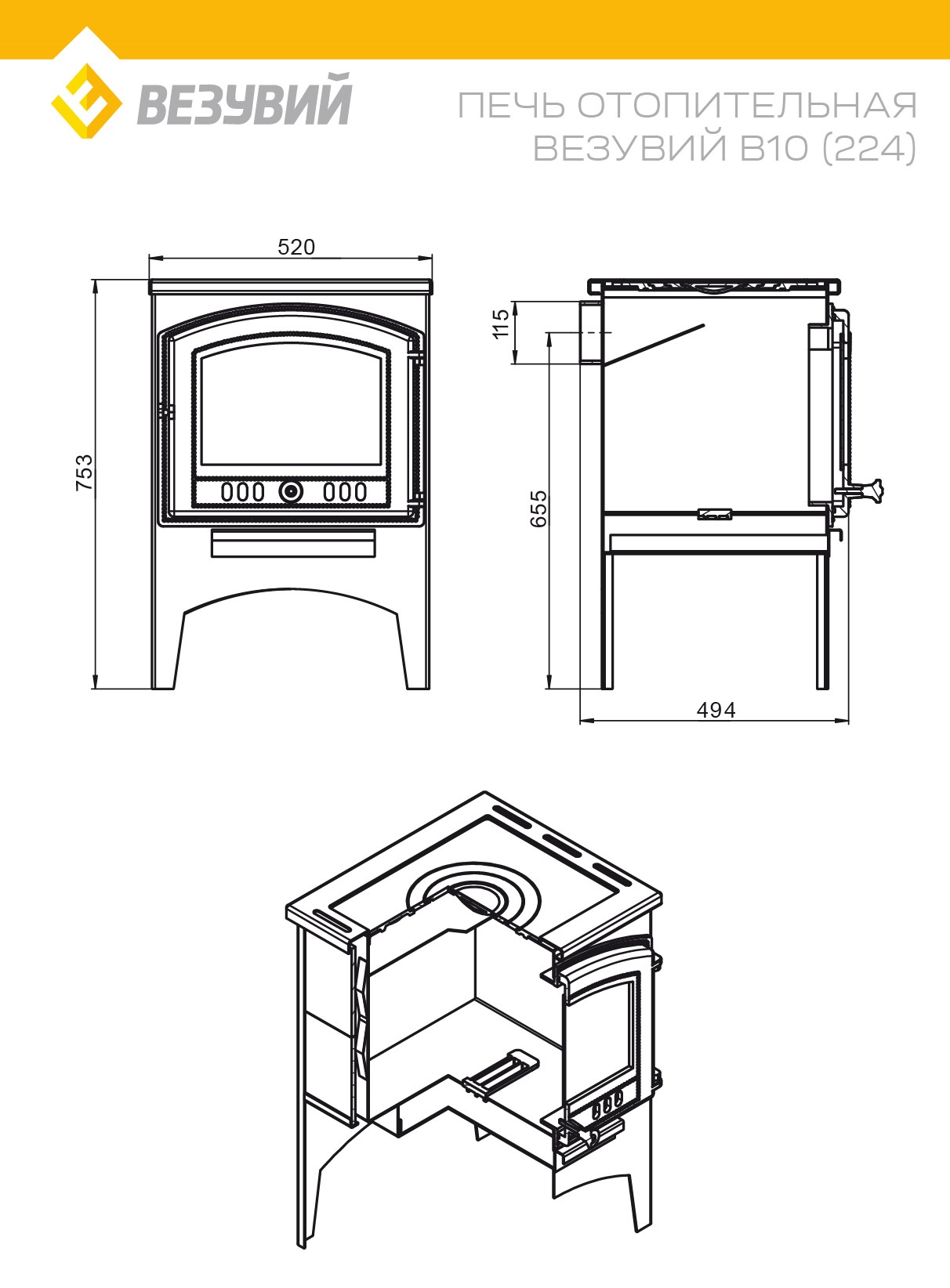 Отопительная печь «Везувий» В10 предназначена для установки в различных хозяйственных и жилых помещениях. Печь изготовлена из специальной конструкционной стали. Верхняя чугунная плита может использоваться для приготовления пищи. Печь укомплектована чугунным колосником и чугунной герметичной дверцей Везувий 217 с жаропрочным стеклом. Печь облицована Керамическими вставками.
