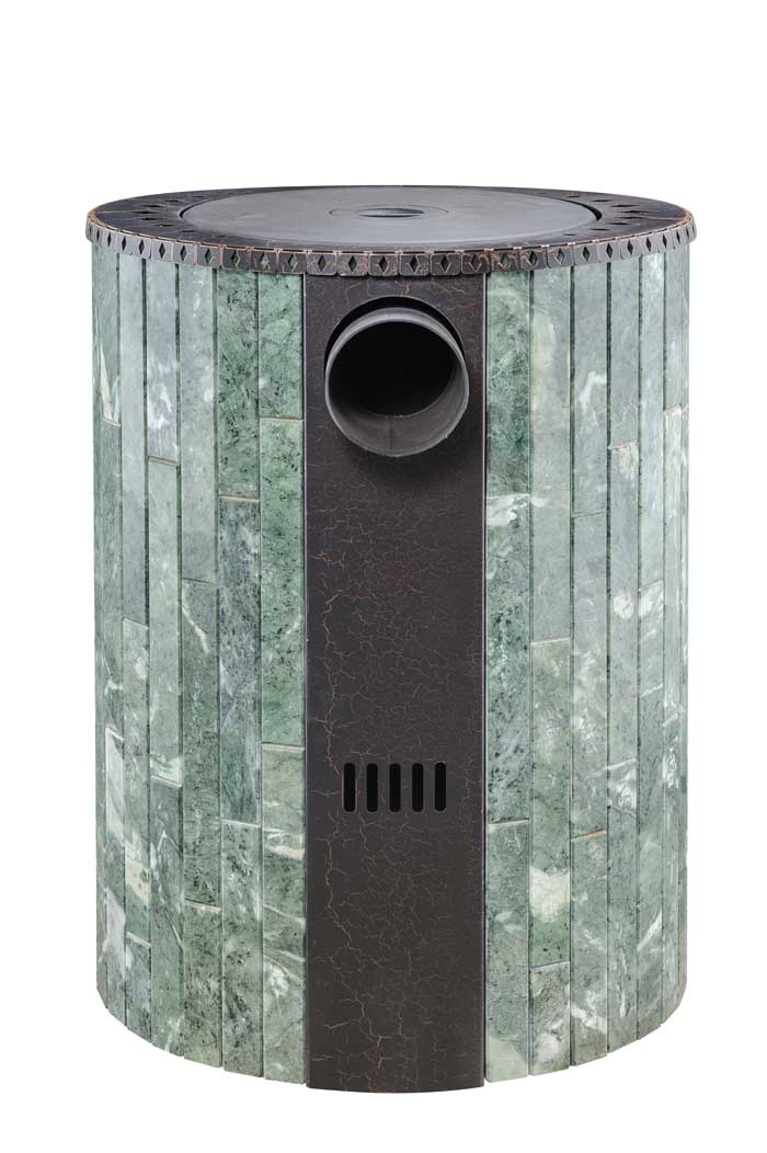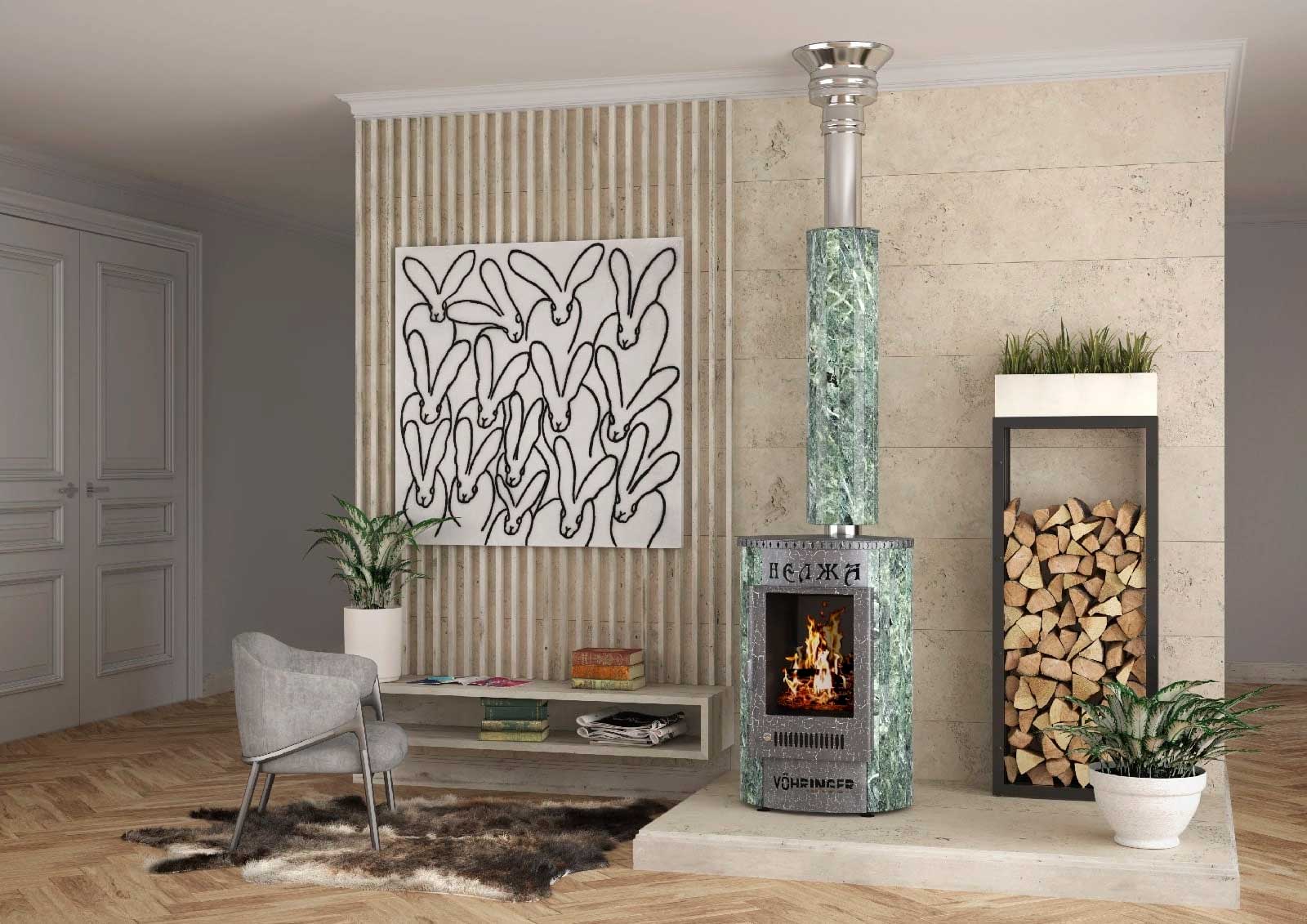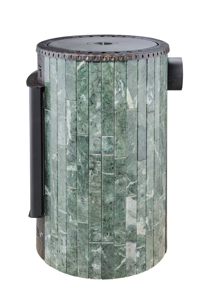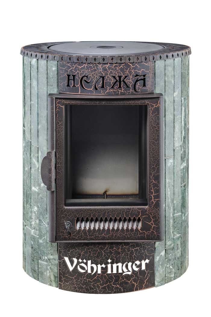 Отопительно-варочная печь «Нелжа» в облицовке натурального камня Змеевик – это дровяная печь бесколосникового типа с устройством для регулировки процесса горения. Печь очень удобна в эксплуатации, вместительна и позволяет поддерживать тепло в доме, не менее 5-8 часов, от одной закладки дров! Варочная поверхность из качественного чугуна, позволит легко и быстро приготовить еду, или просто вскипятить воду. В режиме разогрева температура в помещении за один час, повышается на 16 – 18 градусов, а в режиме медленного горения, печь представляет собой горячий радиатор, с температурой около 100 градусов. Укладка камни под кожухом в боках топки – возможность увеличить теплоёмкость печи положив в ёмкость банные камни.