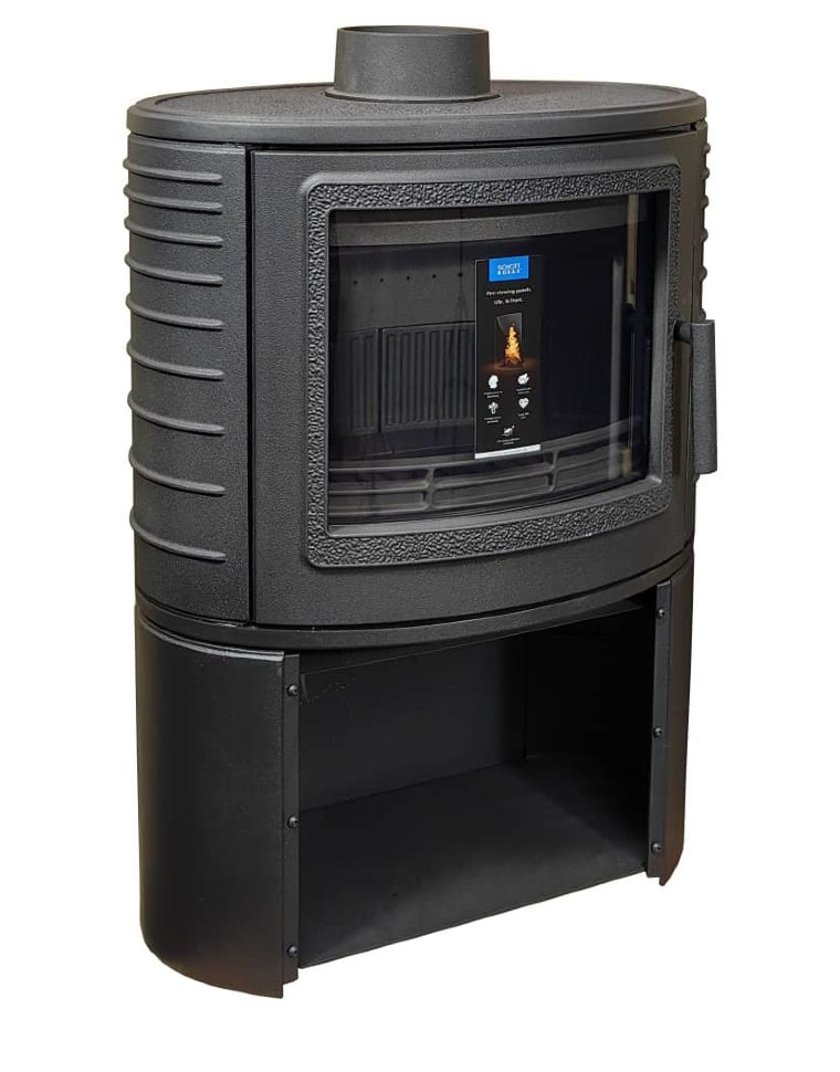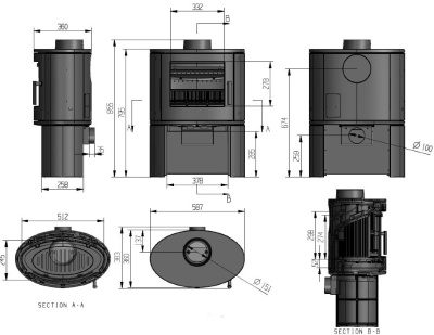 Дымоходную трубу можно установить вверху печи или сзади, есть патрубок для подвода воздуха из вне. Сферическое термостойкое стекло на дверце, увеличивает угол обзора пламени. Внутри топочная камера имеет чугунную футеровку, вторичный дожег дымовых газов, систему «Чистое стекло». Мощность печи позволяет отапливать помещение до 120 м2, экономично расходовать дрова и соответствует Европейским требованиям. Гарантия от производителя 3 года.