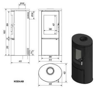 Печь Koza AB изготавливается из двух типов материалов: чугун и сталь (верхняя плита, дверца, решётка).