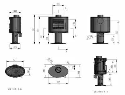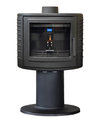 Дымоходную трубу можно установить вверху печи или сзади, есть патрубок для подвода воздуха из вне. Сферическое термостойкое стекло на дверце, увеличивает угол обзора пламени. Внутри топочная камера имеет чугунную футеровку, вторичный дожег дымовых газов, систему «Чистое стекло». Мощность печи позволяет отапливать помещение до 120 м2, экономично расходовать дрова и соответствует Европейским требованиям. Гарантия от производителя 3 года.