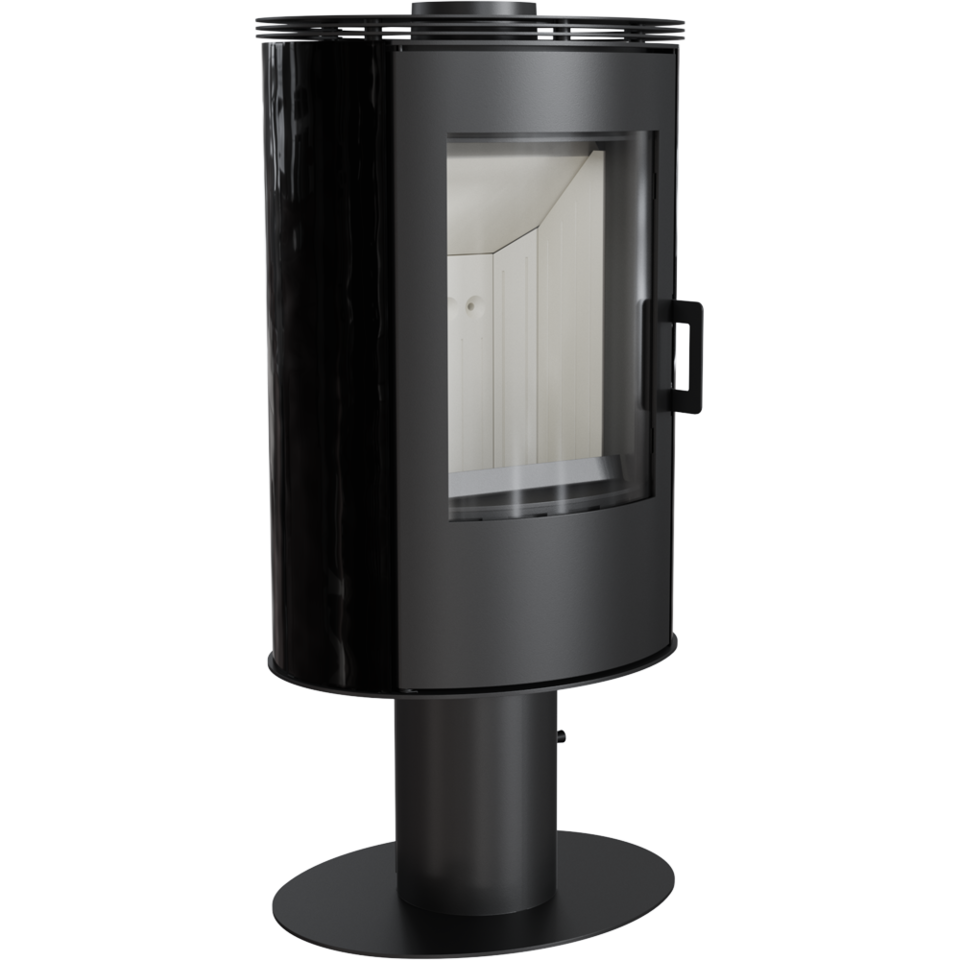 Печь установлена на изящной базе ноге, в основании которой установлен поворотный механизм, благодаря которому печь может вращаться вокруг своей оси, а вы можете наблюдать пламя из любой точки комнаты. Печь-камин декорирована панелями из черной керамики.
