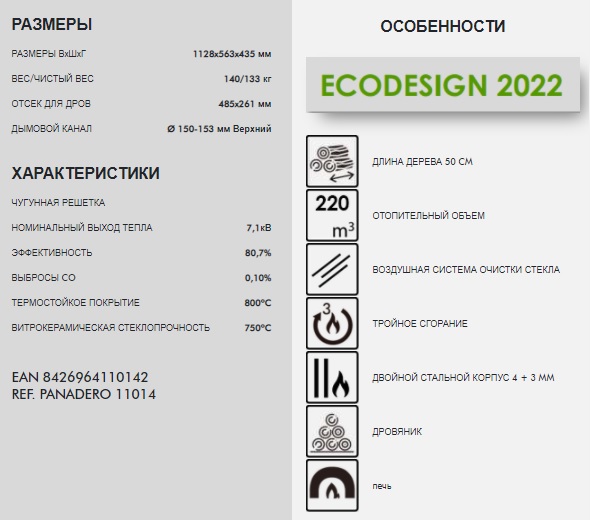 Печь-камин Panadero Gourmet - не просто источник тепла, но и изысканный элемент вашего интерьера, идеально подходящий для просторных помещений размером 1128x563x435 мм.