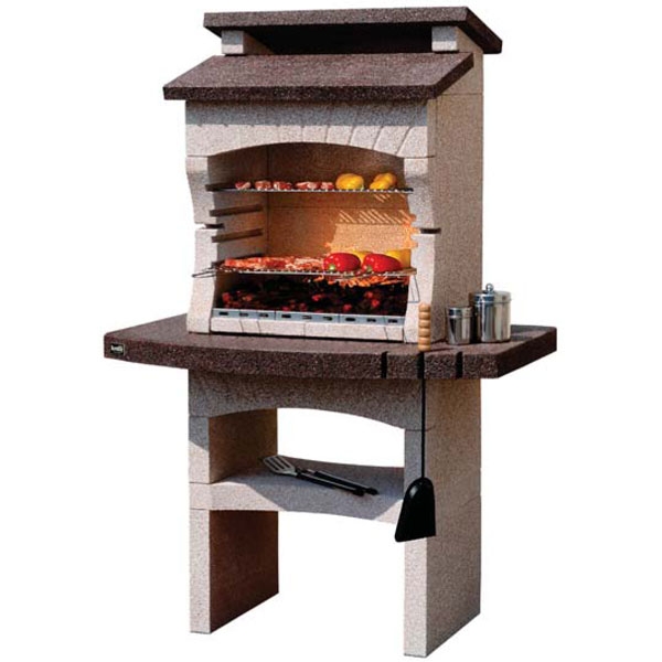 Барбекю с четырьмя уровнями расположения решетки и прорезями для вертела. Барбекю снабжено прорезями для хранения аксессуаров и системой "Легкий огонь". Рабочая поверхность и крыша из полированного Imperial Brown Crystal.
