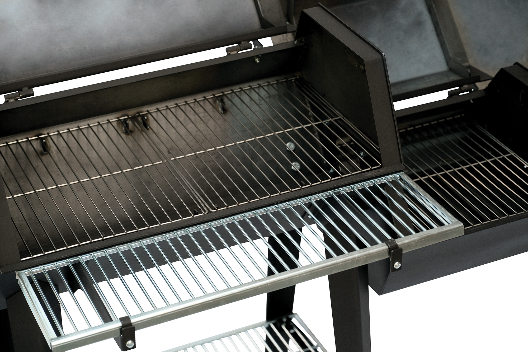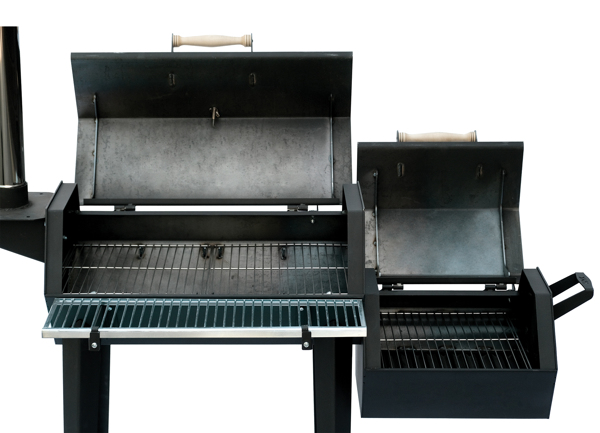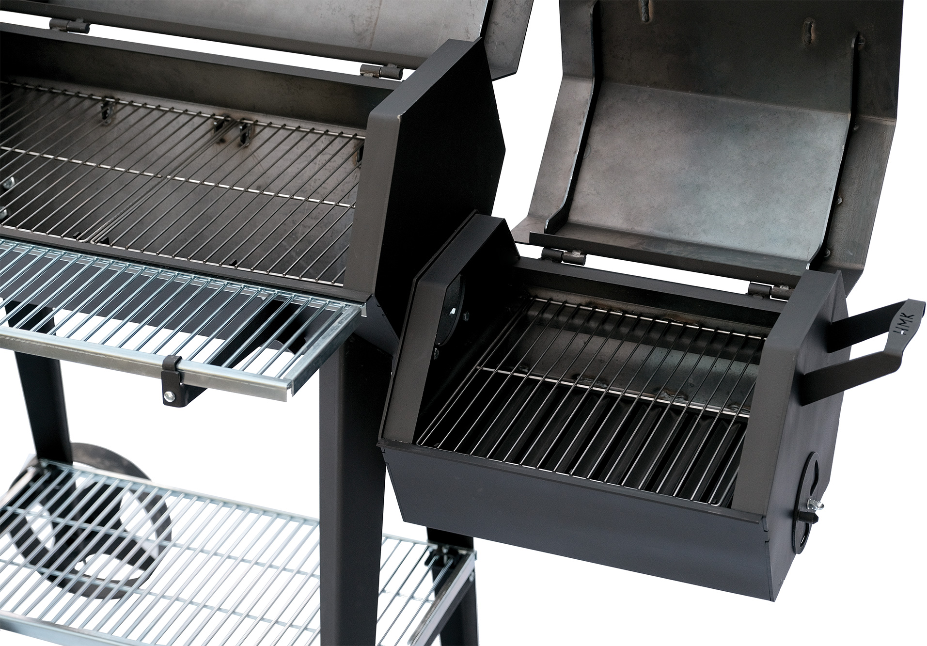 3.Горизонтальная камера в форме бочки – рабочая зона для барбекю, гриля и горячего копчения. Оборудована крышкой, открывающей внутреннюю полость по всей длине. А также решетками из нержавеющей пищевой стали и: внутренней и наружной (прикреплена/приварена сбоку корпуса).