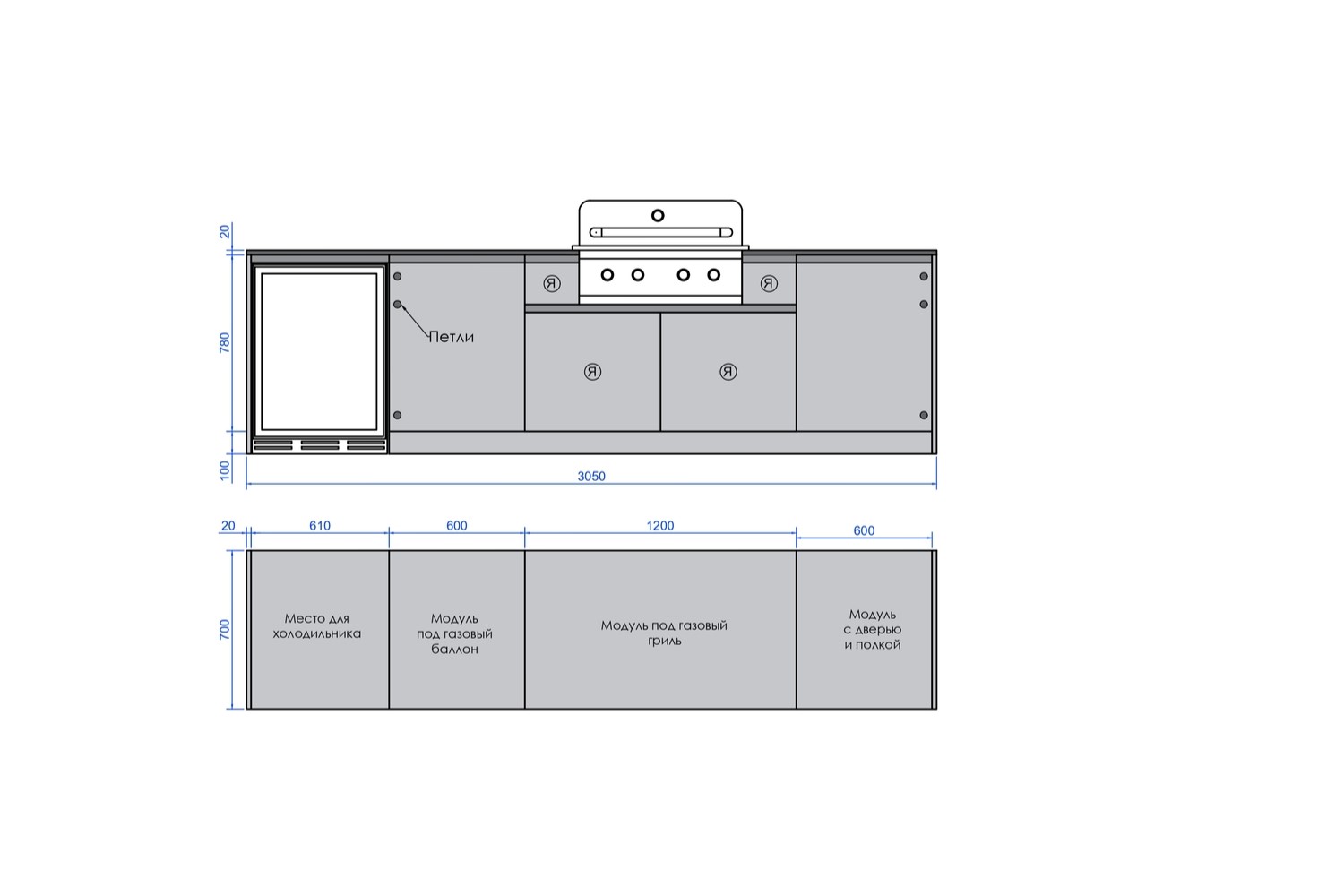 В комплектацию кухни Астов №15 НЕ ВХОДИТ столешница, газовый гриль, газовый баллон, холодильник. Их можно заказать отдельно..