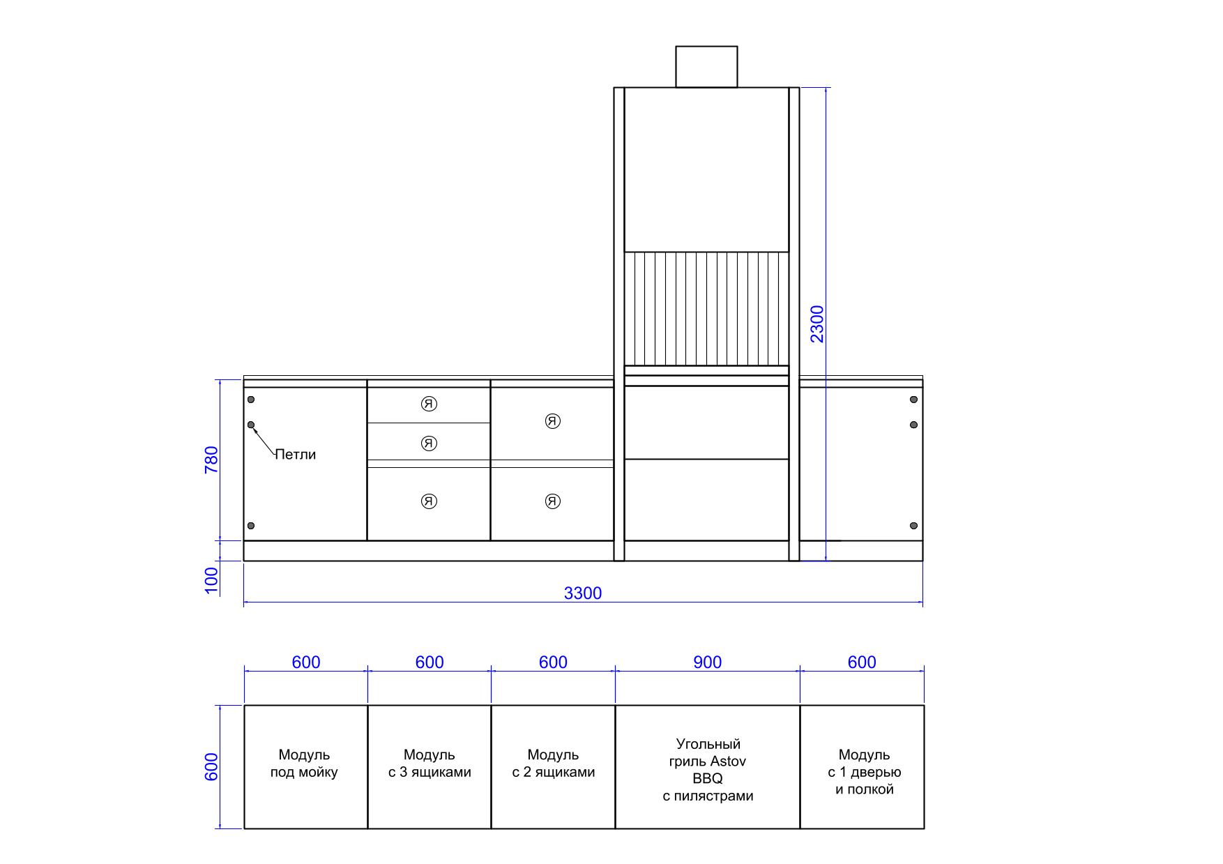 Для идеального сочетания стиля, удобства и долговечности – наша уличная кухня для дачи уличная кухня для дачи в предлагаемой конфигурации. Данная модель исполнена из стали с оцинковкой, что гарантирует её устойчивость к коррозии и возможность длительной эксплуатации. Порошковое покрытие RAL9005 придаёт месту готовки суровый и элегантный внешний вид, вписываясь в любую ландшафтную архитектуру. Базовый комплект включает в себя блоки для мойки и хранения (тумбы с выкатными ящиками, распашные и открытые), гриль на угле с зонтом вытяжки, легкосъёмный цоколь на магнитах. По желанию клиента композиция, как и все наши зоны барбекю из металла зоны барбекю из металла, может быть расширена включением дополнительных модулей и техники.